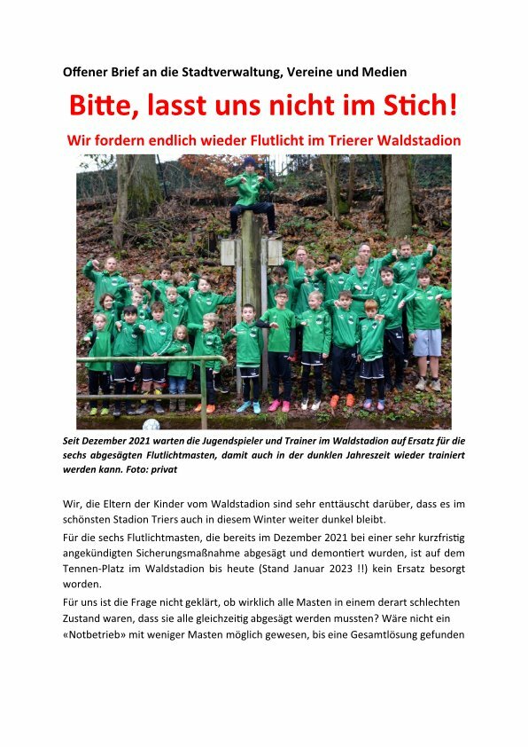 Wir, die Eltern der Kinder vom Waldstadion sind sehr enttäuscht darüber, dass es im schönsten Stadion Triers auch in diesem Winter weiter dunkel bleibt. Für die sechs Flutlichtmasten, die bereits im Dezember 2021 bei einer sehr kurzfristig angekündigten Sicherungsmaßnahme abgesägt und demontiert wurden, ist auf dem Tennen-Platz im Waldstadion bis heute (Stand Januar 2023 !!) kein Ersatz besorgt worden.