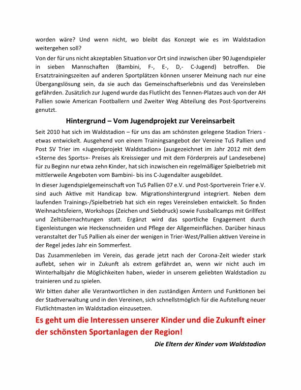 (Fin) In dem Schreiben (s. Anhang) dem eine Unterschriftenliste beigefügt ist, wenden sich die Eltern unter der Überschrift »Bitte lasst uns nicht im Stich« an die Stadtverwaltung, Vereine und Medien und fordern endlich wieder Flutlicht auf dem Tennen-Platz im Waldstadion. Die Ersatztrainingszeiten in anderen Sportstätten für die inzwischen über 90 Kinder in sieben Mannschaften (Bambini bis C-Jugend) der Jugendspielgemeinschaft von TuS Pallien 07 und Post-Sport-Verein könnten nur eine Übergangslösung sein. Das gerade nach der Corona-Zeit wieder auflebende Vereinsleben werde so stark beeinträchtigt. Überdies würden diese Trainingszeiten häufig noch ausfallen, so die Eltern gegenüber dem Wochenspiegel, der seit 2010 die Patenschaft für die »Kids vom Waldstadion« übernommen hat.