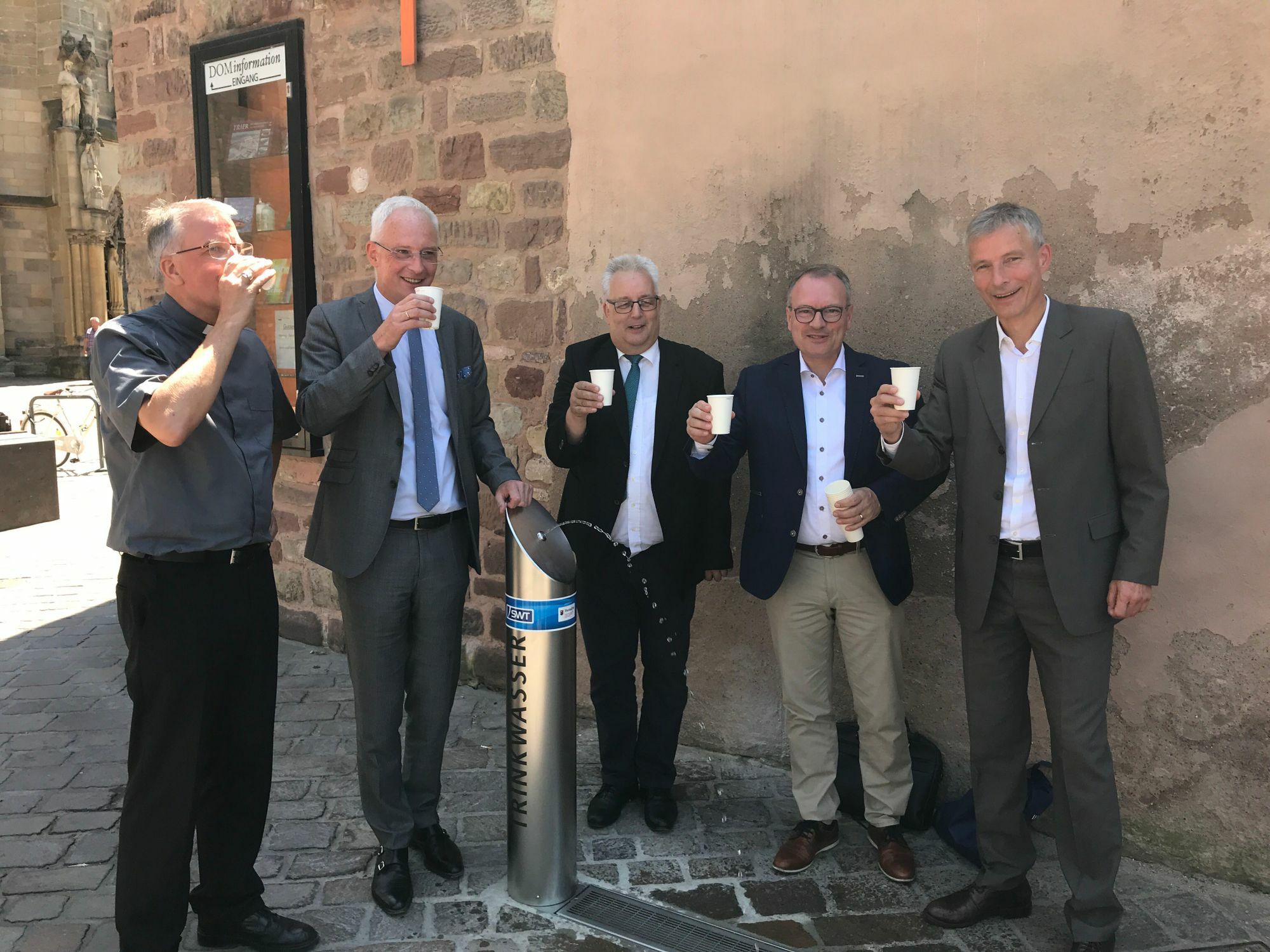 Weihbischof Jörg Peters, OB Wolfram Leibe, Dezernent Andreas Ludwig sowie die SWT-Vorstände Arndt Müller und Steffen Maiwald (v.l.) testen den neuen Wasserspender. Foto: Presseamt Trier