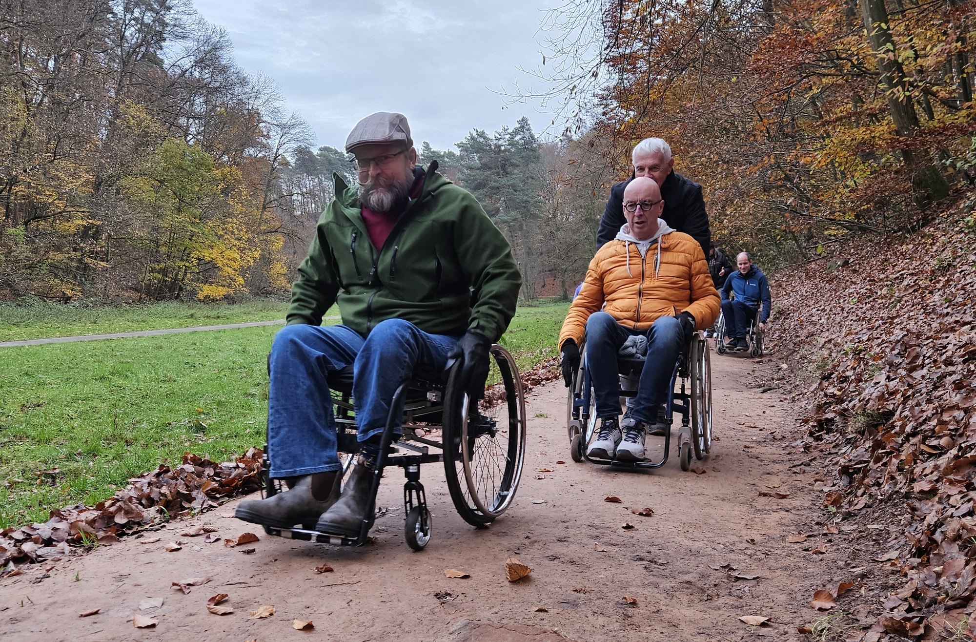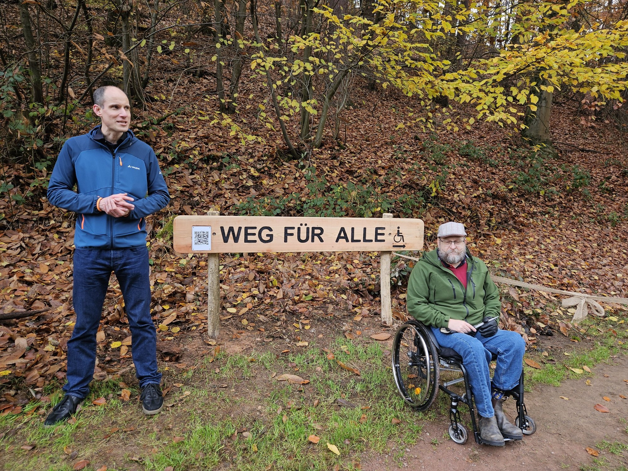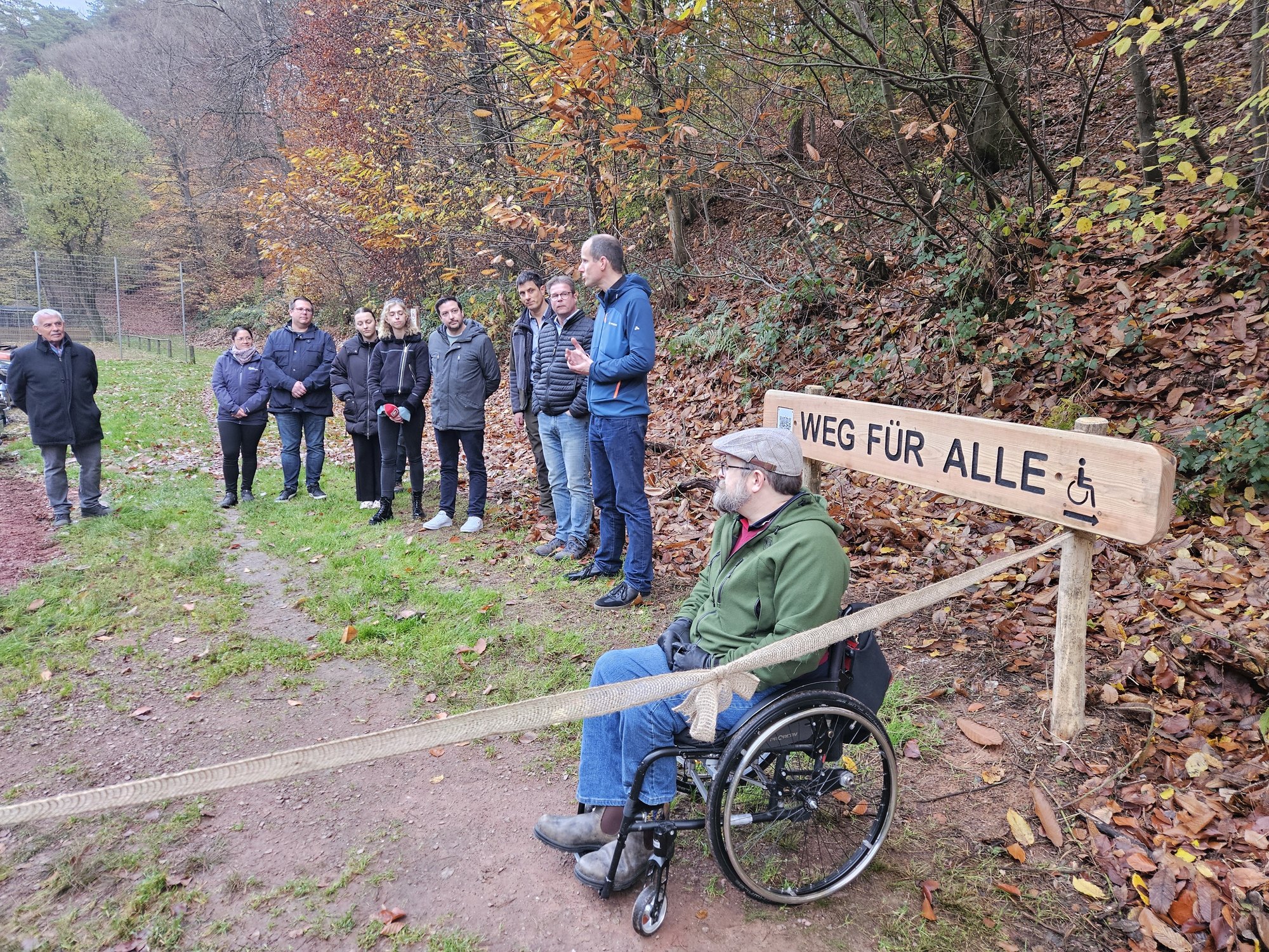 Zur Eröffnung setzten sich Dr. Thilo Becker und Gerd Dahm selbst in Rollstühle, begleitet von weiteren Rollstuhlfahrerinnen und -fahrern, um die Barrierefreiheit des Weges zu testen.