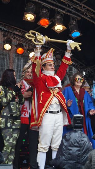 Nach der traditionellen Erstürmung des Rathauses zogen die Narren vom Augustinerhof zum Hauptmarkt. Dort übergab Oberbürgermeister Wolfram Leibe um 11.11 Uhr den Stadtschlüssel an Prinz Elmar I. Prinzessin Semra I. konnte krankheitsbedingt - wie so oft in dieser Session - nicht am karnevalistischen Auftakt teilnehmen. Prinz Elmar I. verkündete die närrischen Gesetze kurzerhand alleine. Fotos: Labako