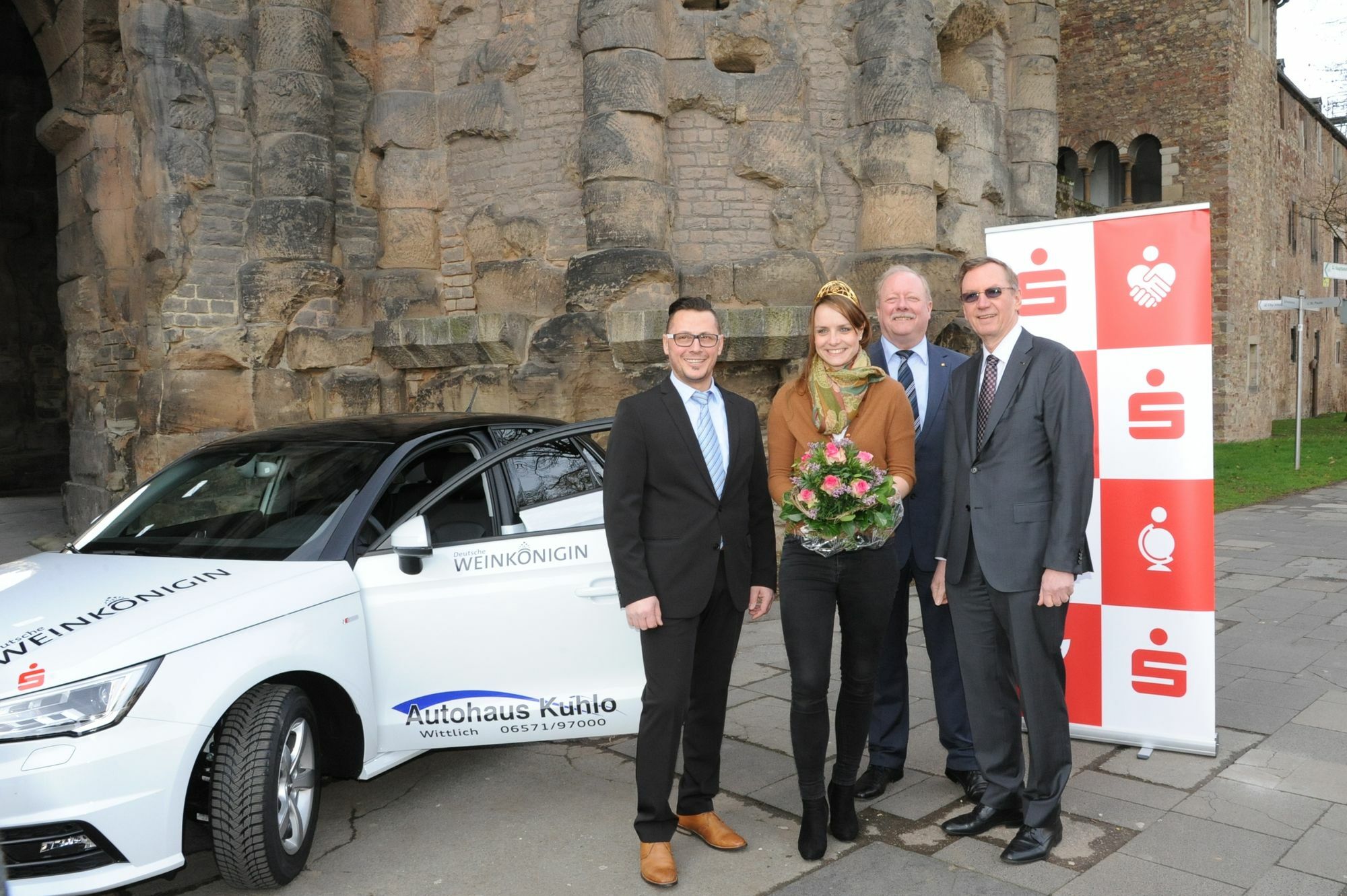 Lena Endesfelder, amtierende Deutsche Weinkönigin aus Mehring, flitzt nun mit einem krachneuen weißen Audi mit schwarzem Dach von Termin zu Termin. Der "Dienstwagen" der Repräsentantin des Weins und der Region ist ein Geschenk dreier Partner: der Sparkasse Trier, des Autohauses Kuhlo in Wittlich und des Vereins Moselwein, der Gebietsweinwerbung. Die offizielle Übergabe des Autos war standesgemäß an der Porta Nigra in Trier. Den Hauptsponsor vertrat Sparkassen-Vorstandsvorsitzender Günther Passek, das Autohaus Gerardo Strusi und den Moselwein e.V. Vorsitzender Rolf Haxl.