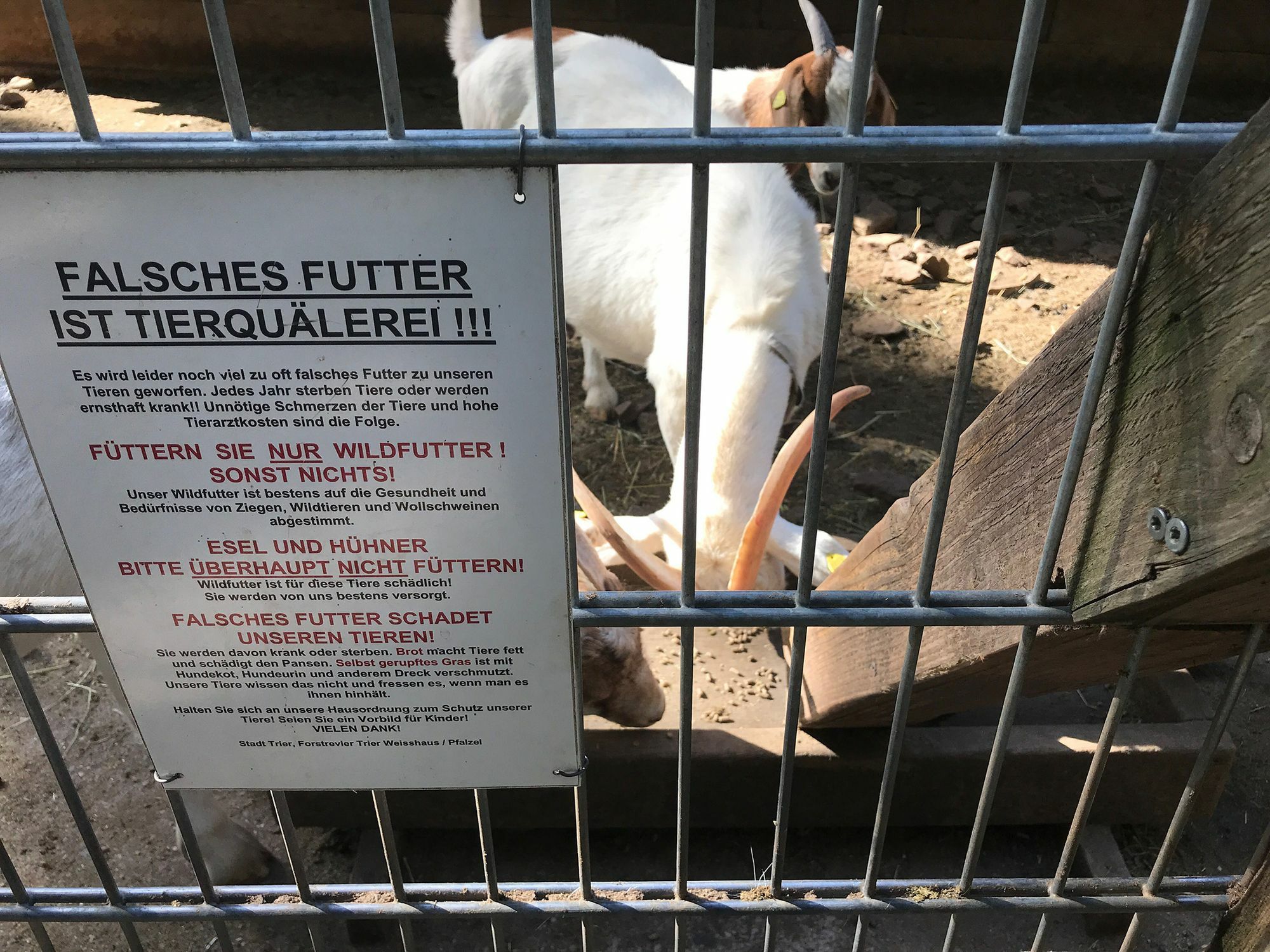 Das Fütterungsverbot gilt nicht nur für die Ziegen, sondern für alle der rund 150 Tiere vor Ort. So musste an Ostern schon ein falsch gefüttertes Mufflonschaf eingeschläfert werden. Vor einigen Jahren lag ein Damhirsch morgens tot im Gehege, weil abends Besucher Brot ins Gehege geworden hatten. "Wir haben diese Probleme immer wieder", sagt Kerstin Schmitt, "Tiere werden krank, haben Durchfall, schwere Koliken oder sterben innerhalb kürzester Zeit."