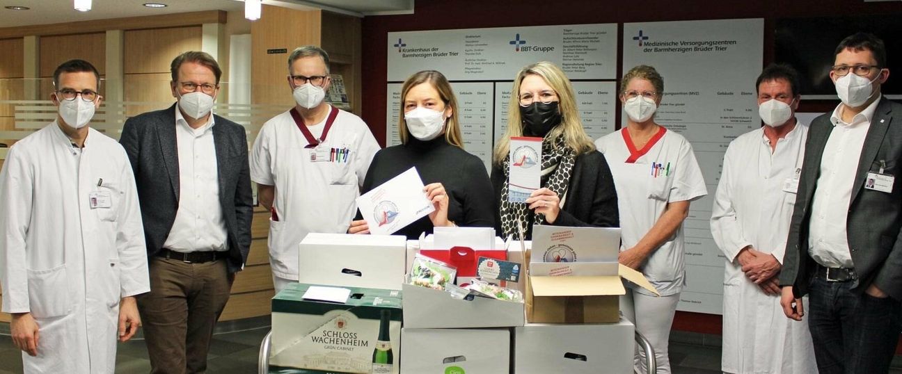 Trier. »Wertschätzung, Miteinander, Zusammenhalt«: Das ist das Motto des Vereins Zusammen stehen - gemeinsam gehen, der sich für gemeinnützige Projekte und bedürftige Menschen in der Region Trier einsetzt. Auf die Initiative des Vereins hin haben sich Unternehmen in Trier an einer großzügigen Spende beteiligt, um dem durch die Pandemie besonders belasteten Pflegepersonal für seinen Einsatz zu danken. Gemeinsam mit der Vereinsvorsitzenden Sarah Schmidt-Immendorf überreichte Vereinsgründerin Rike Port dem Klinikum Mutterhaus 80 und dem Krankenhaus der Barmherzigen Brüder 120 Verzehrgutscheine regionaler Gastronomen, Piccolos des Weinherstellers Schloss Wachenheim sowie Handseifen und -lotionen der Firma Cosmolux. Diese werden nun an die Pflegekräfte der Intensiv- und Coronastationen verteilt.