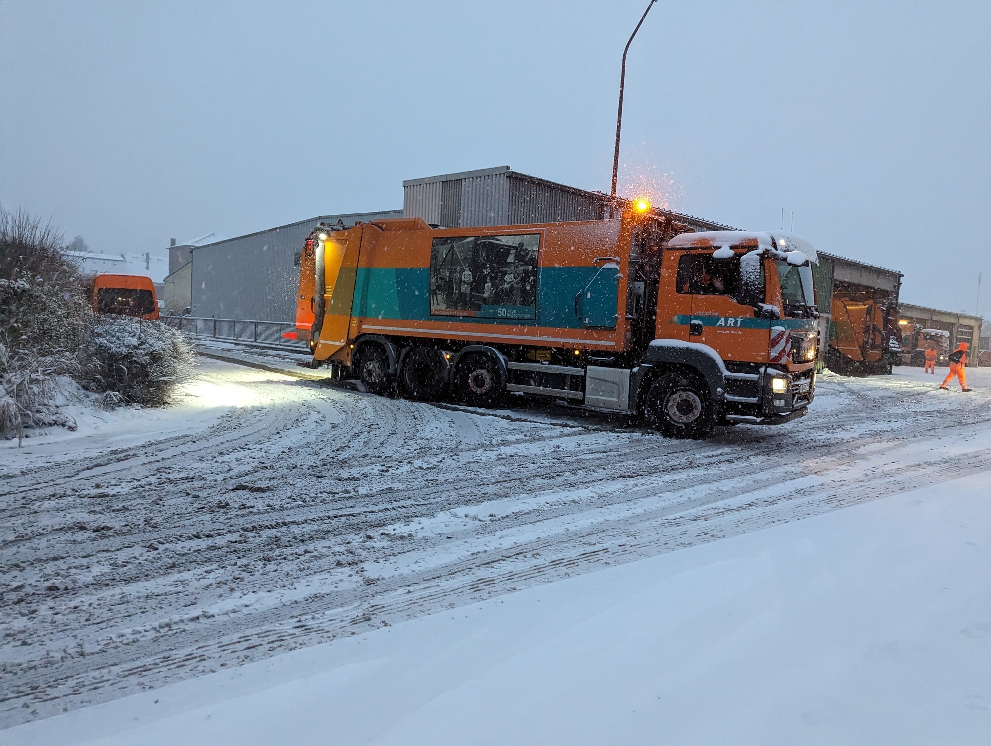 Schnee von den Gehwegen sollte beim Räumen nicht auf die Stra-ße geschoben werden. Auch das verengt die Fahrbahn und die Straße wird für die Sammelfahrzeuge unbefahrbar. Abfallbehälter sollten außerdem nicht hinter einem Schneewall stehen. Optimal ist ein freigeräumter Zugang vom Stellplatz der Abfallbehälter zur Straße. Insbesondere große Container von Mehrfamilienhäusern müssen frei zugänglich sein. Sollte eine Straße nicht befahrbar sein, können die Abfallbehälter bzw. Gelben Säcke zur nächsten befahrbaren Straße gebracht wer-den. Dies ist der beste Weg, um eine Leerung sicherzustellen.