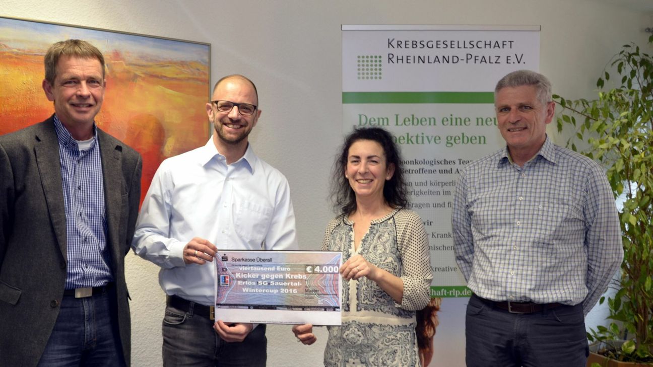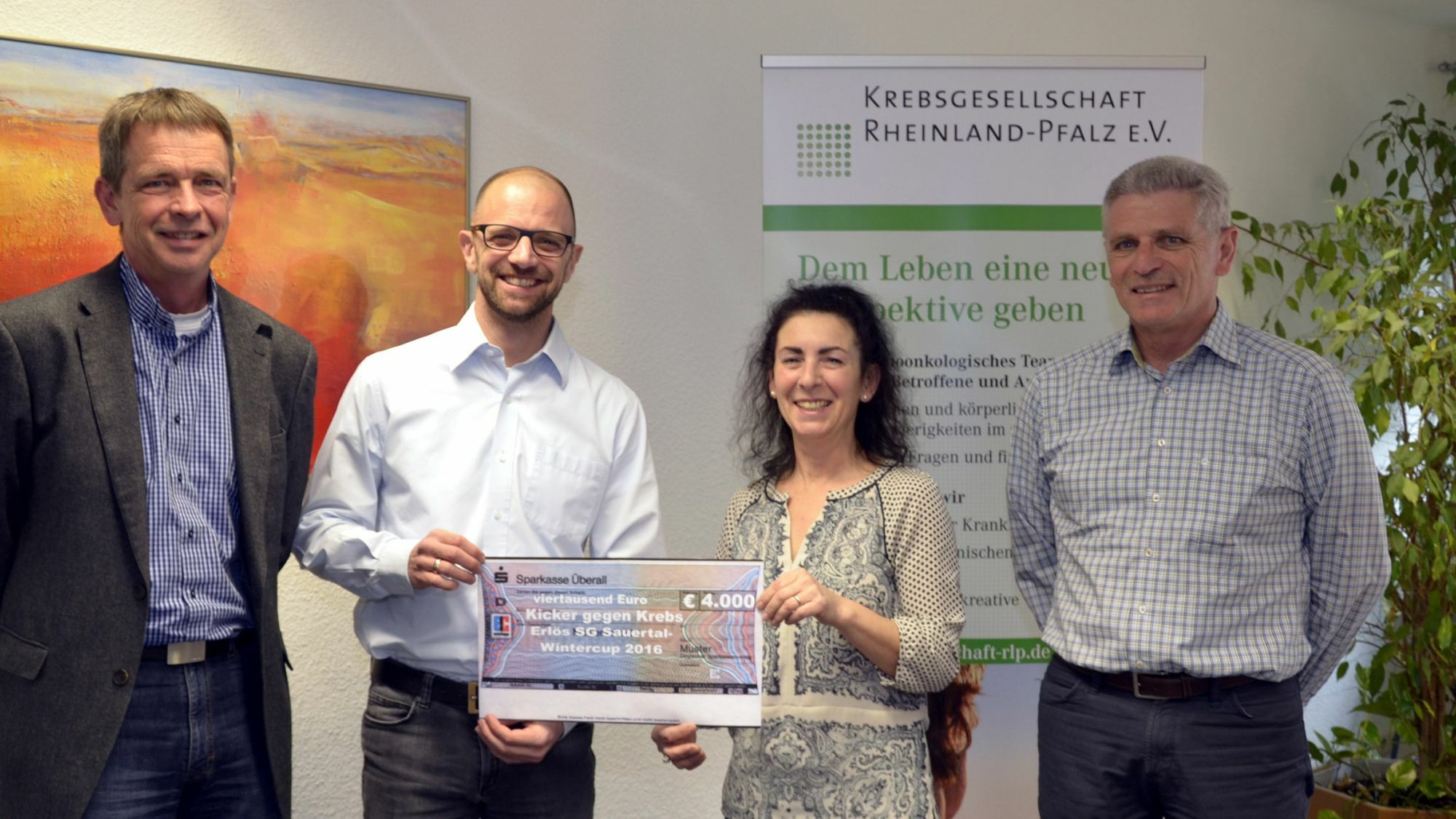 Im Bild von links: Andreas Luce (SG Sauertal), Andreas Duckart (»Kicker gegen Krebs«), Carlita Metzdorf-Klos, Leiterin des Beratungszentrums Trier der Krebsgesellschaft Rheinland-Pfalz), Klaus Pallien (SG Sauertal).