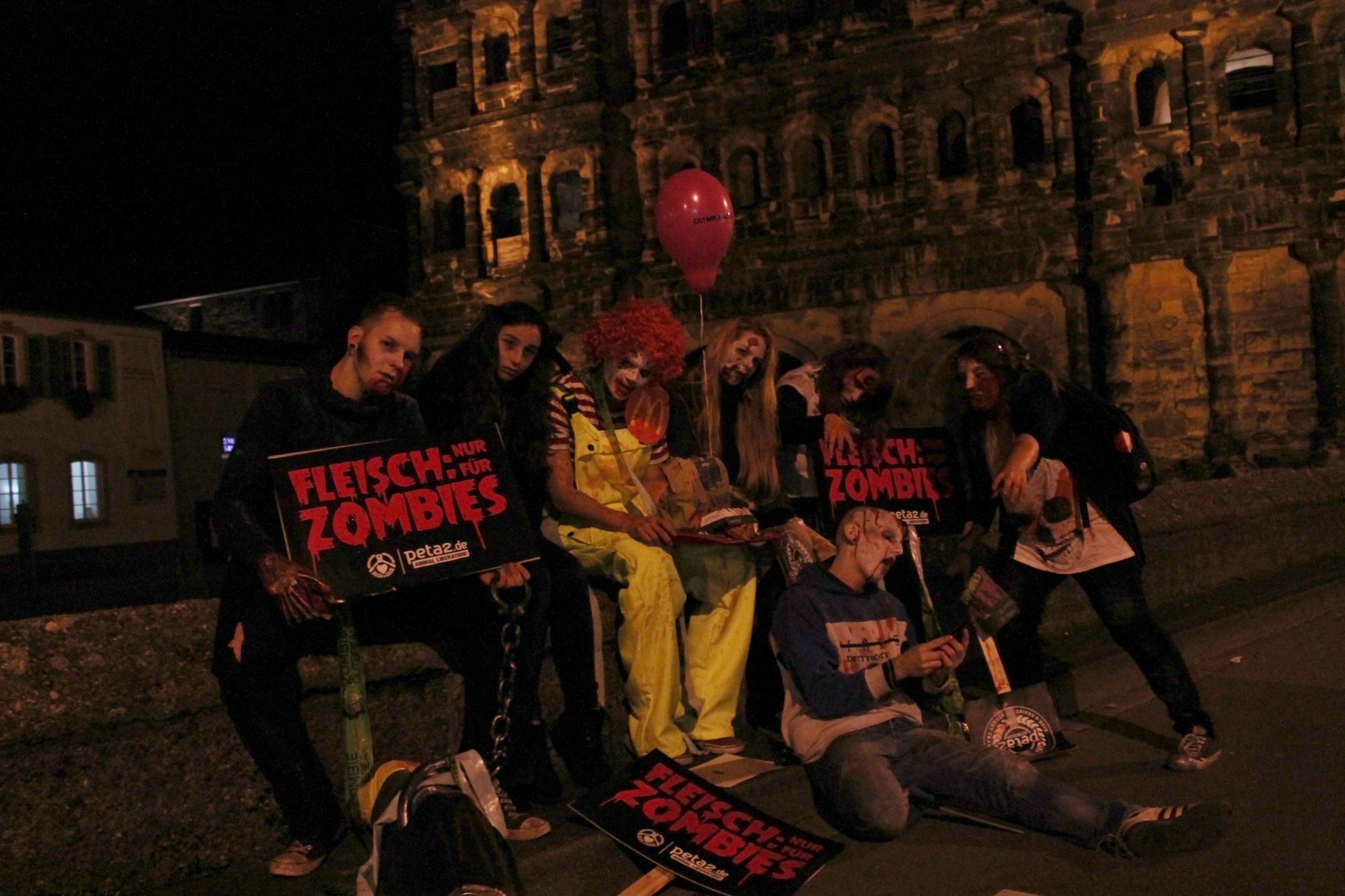 Mitten auf dem Hauptmarkt sorgten die Aktivisten im Alter von 16 bis 30 Jahren für Aufsehen. Sie hielten Schilder hoch auf deinen "Fleisch: Nur für Zombies" zu lesen stand. Außerdem schleiften sie eine Art Leichensack hinter sich her. Offene Wunden und jede Menge Blut sollten zudem auf das Tierleid aufmerksam machen. Aber: Alles vegan und tierversuchsfrei, wie PETA2 in einer Pressmitteilung erklärt. Denn für die jungen Menschen geht es um die Botschaft: Niemand muss Tiere quälen und töten für ein paar Minuten Gaumenfreude. "Es gibt so viele pflanzliche und damit tierleidfreie Alternativen zu Fleischprodukten", erklärt Mario Burbach, Mitkoordinator des Streeteams. Die "Zombies" reichten deshalb auch Flyer an Passanten mit Hinweisen, warum man kein Fleisch brauche. Fotos: FF