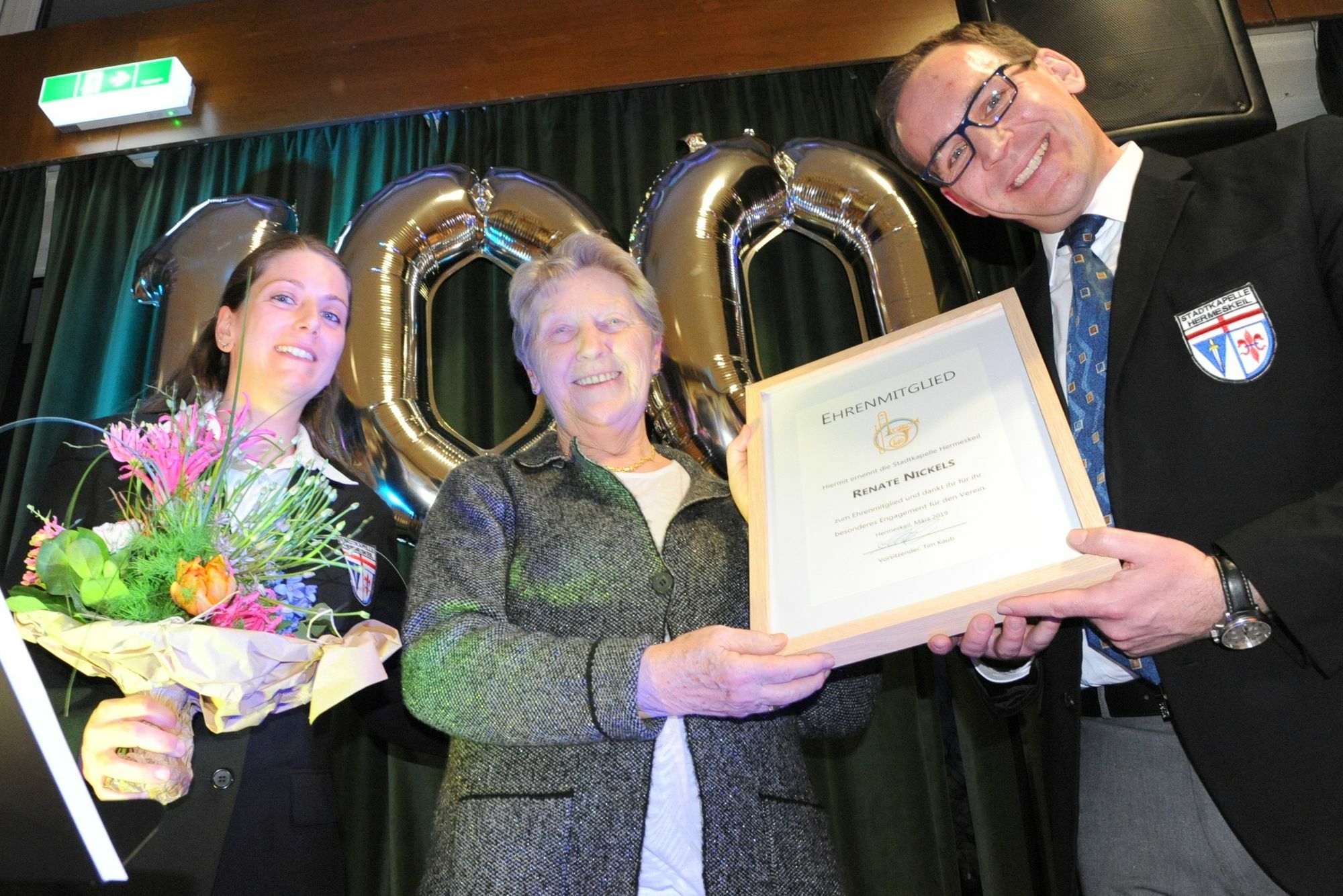 Für Renate Nickels, die im Rahmen der Feier als neues – und erstes weibliches – Ehrenmitglied ernannt wurde, trifft das in jedem Fall zu. Als Mitglied einer Familie, die den Verein seit Generationen unterstütze, fehlt sie laut Kaub bei keiner Veranstaltung. Und sie habe nicht nur als Kleiderwartin, die sich um mehr als 300 Uniformen und Kostüme kümmere, sondern auch in Küche und Service "das Kommando". Und das soll auch so bleiben, wie die sichtlich gerührte Geehrte durchblicken ließ. Sie werde auch künftig ihre Arbeit machen und auf ordentliche Kleidung vor allem der "jungen Damen und Herren" achten.