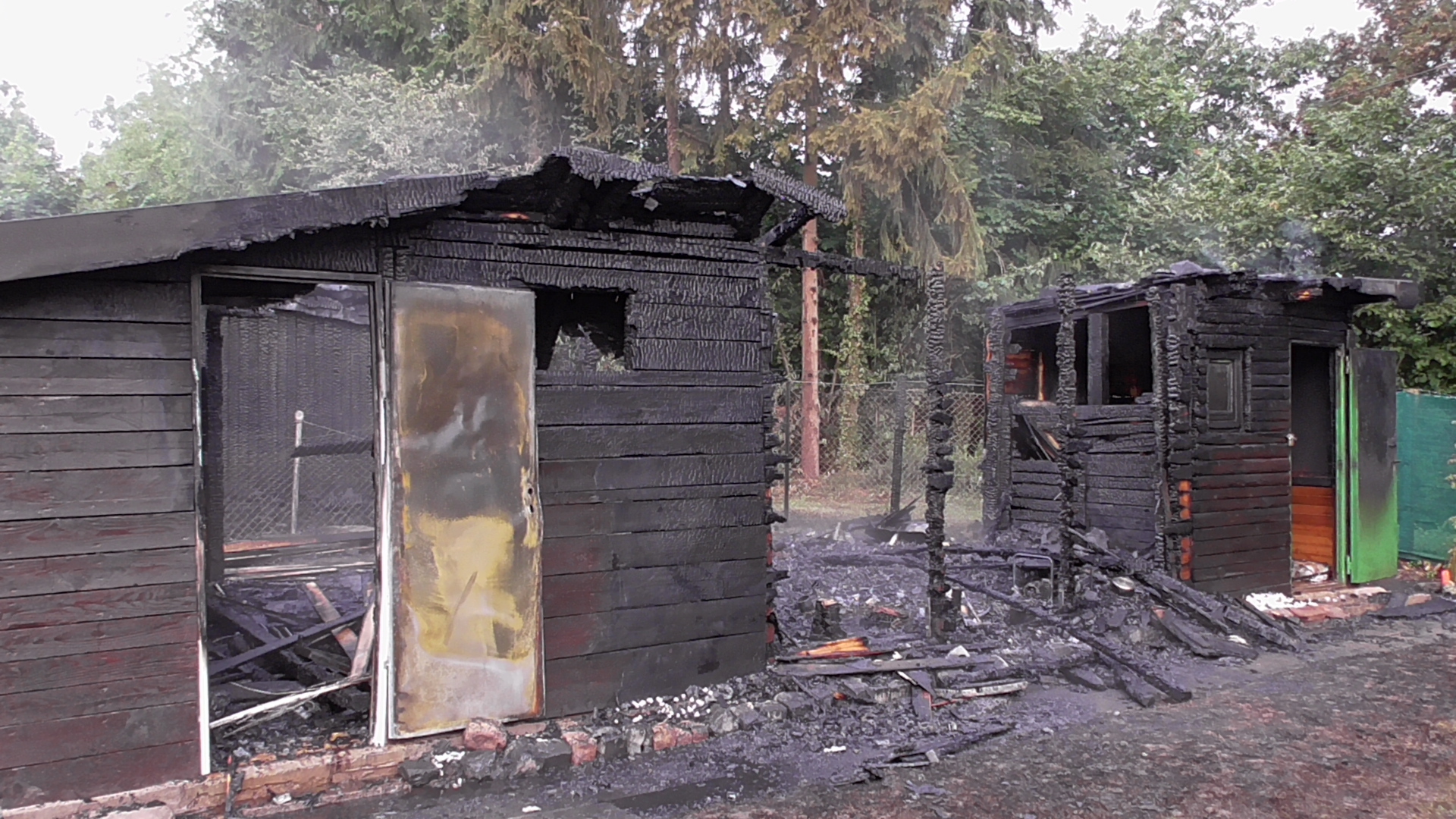 Ein Gartenhaus war innerhalb weniger Sekunden komplett in Flammen geraten. Die Flammen breiteten sich schnell auf ein zweites Gartenhaus sowie auf ein kleines Waldstück aus.