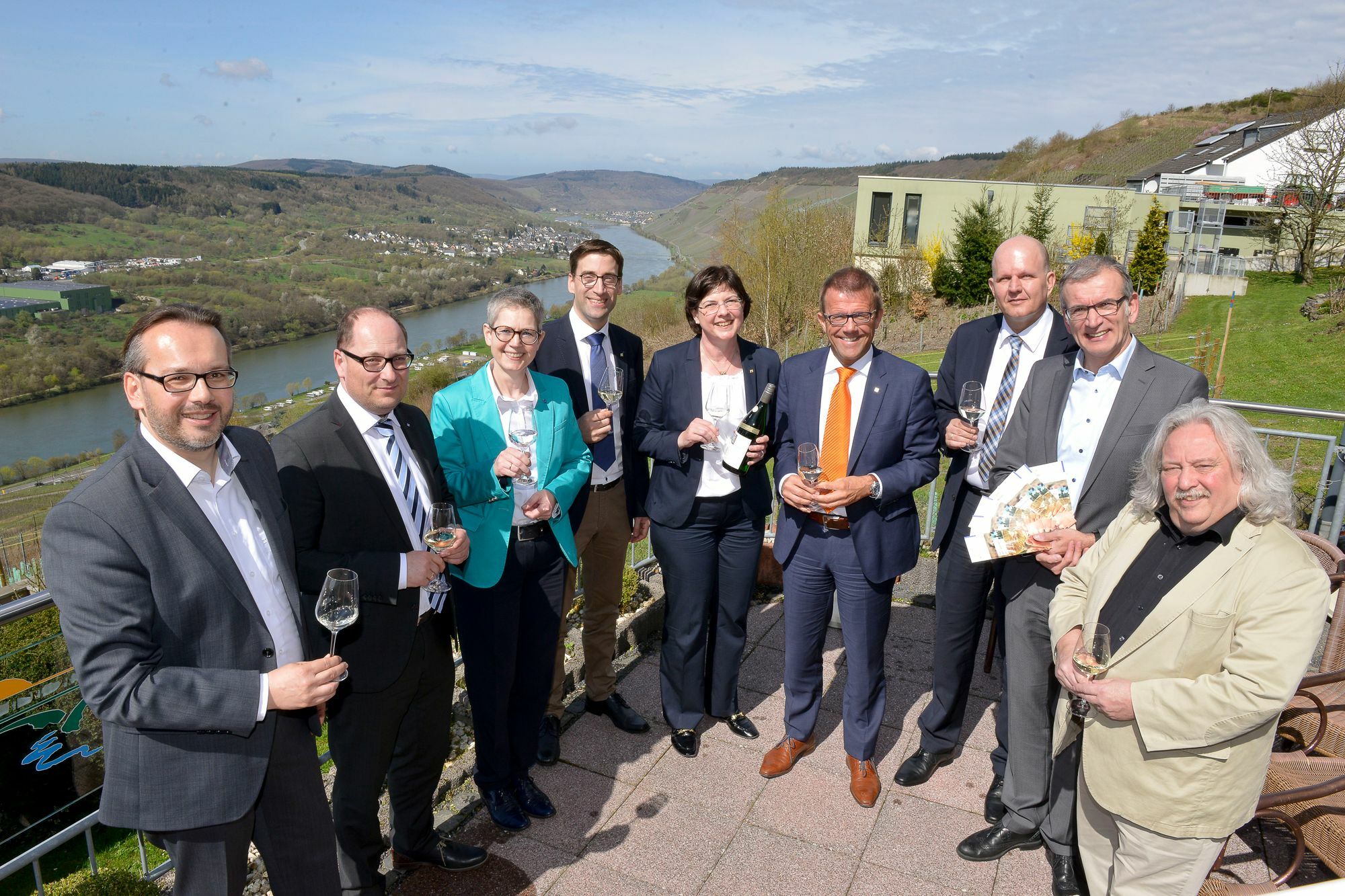 Von links: Ansgar Schmitz (Moselwein e.V.), Michael Hoeck (Volks- und Raiffeisenbanken), Anna Roeren-Bergs (DEHOGA), Achim Rosch (DLR Mosel), Jutta Schneider (Landwirtschaftskammer), Gereon Haumann (DEHOGA), Thomas Müller (Spiegelau), Albrecht Ehses (IHK Trier) und Dieter Reiss (Projektleitung). Foto: FF