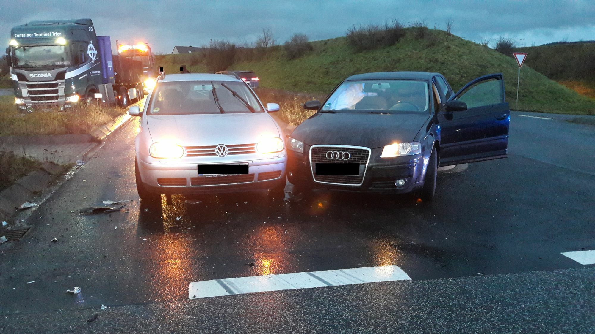 Ein 62-jähriger Audifahrer wollte aus Richtung Ehrang nach links in Richtung Ermesgraben abbiegen. Zeitgleich kam ein 67-Jähriger mit seinem Ford Focus aus Richtung Schweich gefahren. Im Kreuzungsbereich kam es zur Kollision der beiden Fahrzeuge. Durch die Wucht des Aufpralls wurde der Audi auf einen an der Abfahrt zur B 53 stehenden VW geschleudert. Der Ford Focus wurde ebenfalls etwa 50 Meter weiter geschleudert und blieb schwer beschädigt auf der B 53 stehen. Der Fahrer des Ford Focus und seine 62-jährige Beifahrerin wurden leicht verletzt in umliegende Krankenhäuser verbracht. An den drei Fahrzeugen entstand ein Schaden von circa 25.000 Euro. Im Einsatz waren neben der Polizei Schweich, drei Rettungswagen, ein Notarzt sowie zwei First Responder. Die B 53 musste für die Verkehrsunfallaufnahme für etwa eine Stunde voll gesperrt werden. Fotos: Agentur Siko