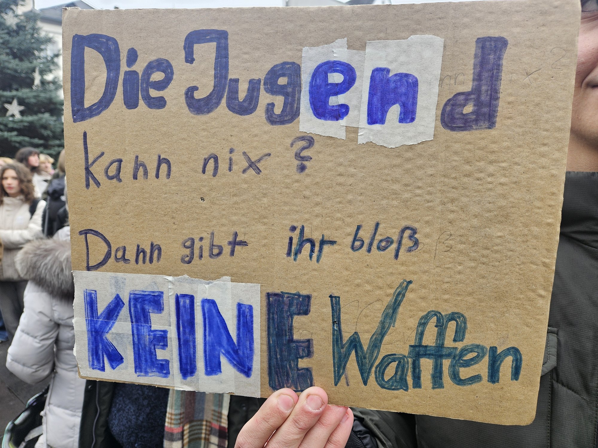 In mehreren Redebeiträgen machten die Schülerinnen und Schüler deutlich, dass sie für die Entscheidung der Politik keinerlei Verständnis haben. „Wir wissen doch schon jetzt, dass das Losverfahren kommen wird, weil sich nicht genug junge Männer melden werden. Eine Wehrpflicht durch die Hintertür“, erklärte ein Schüler. Ein anderer ergänzte: „Wir werden gar nicht nach unserer Meinung gefragt. Ich will auf keinen Fall Menschen töten.“