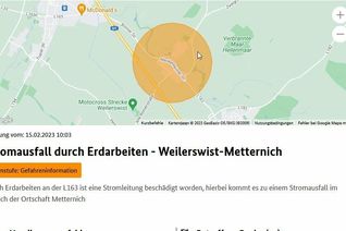 Kreis Euskirchen Stromausfall in Metternich / Stromleitung bei Erdarbeiten beschädigt 15.02.2023 Wie die Warn-App Nina mitgeteilt hat, kommt es in Weilerswist-Metternich derzeit zur einem Stromausfall.