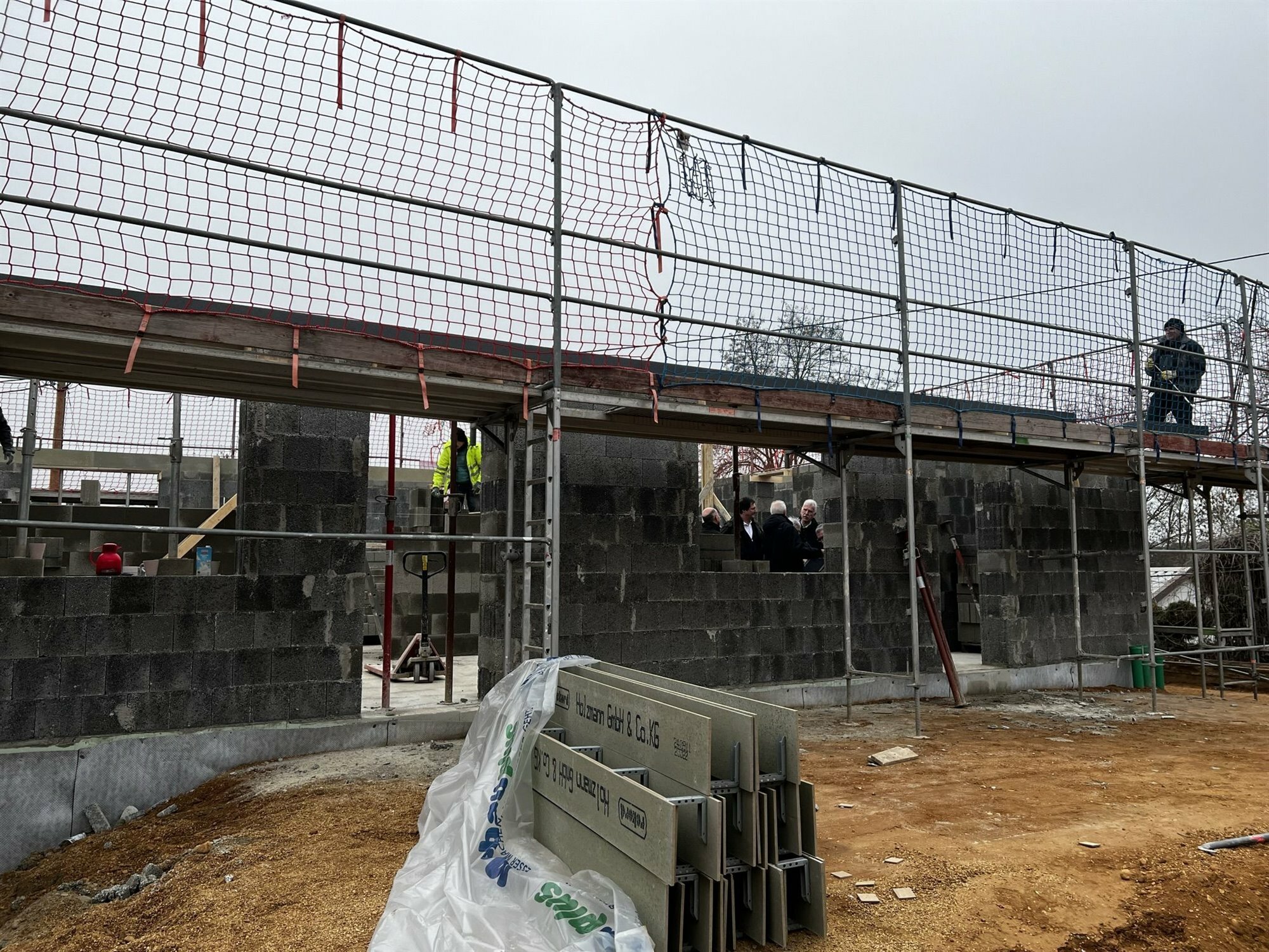 Derzeit ist das Team von Gerd und David Manstein von Manstein Bau dabei, den Rohbau in Massivbauweise hochzuziehen. „Wir haben uns dazu entschlossen, das Erdgeschoss komplett in Beton herzustellen“, so Gerd Manstein. Mit dieser Bauweise sei man besser gegen Fluten gewappnet, „die hoffentlich nie mehr wiederkehren“.