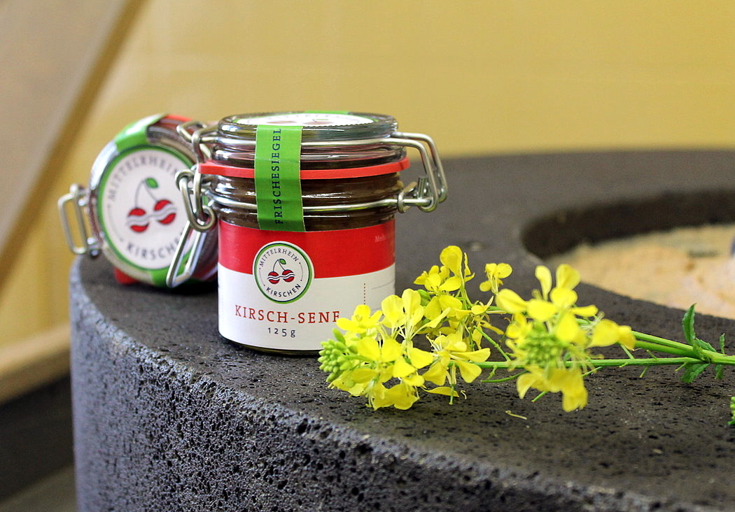 Diese erleben jetzt ein kulinarisches Revival. Doch nicht nur „einfach“ als Kirschen, sondern in besonderen Spezialitäten. So können Feinschmecker ihre Gerichte beispielsweise mit dem Kirsch-Senf (Senfmühle Boppard) verfeinern. Die scharfe und würzige Note des Senfs trifft harmonisch auf das süße und fruchtige Aroma der Mittelrhein-Kirsche. Aus feinstem Ziegenfleisch wird die Salami mit Mittelrhein-Kirschen hergestellt und erhält einen ausgewogenen und einzigartigen Geschmack. Jahrelang produzierte der Holzfelder Ziegenhof einen ausgewogenen Ziegenkäse, der mit Kirschen verfeinert wird. Nachdem der Ziegenhof seine Pforten geschlossen hat, soll die Produktion an anderer Stelle weitergehen. Aber auch über die Genussregion Nahe-Rhein-Hunsrück hinaus verwenden Hersteller die Mittelrhein-Kirschen als geschmackliche Besonderheit für ihre Produkte, die sich gleichsam in den Regalen am Mittelrhein wiederfinden. Wanderer kennen vielleicht den „Rheinbeißer“. Der Riegel sorgt für einen stärkenden Energieschub, wobei sich der fruchtige Akzent harmonisch in einen Mix aus Kürbiskernen, Haferflocken, Haselnüssen und Walnüssen fügt. Weiter können sich Schleckermäuler an einer Schokoladentafel sowie der Praline „Perle von Filsen“ mit Kirschen erfreuen (diese gibt es allerdings nicht überall). Selbst ein Kirsch-Leberpaté wird angeboten.Mittelrheinkirschen werden auch dirket verarbeitet