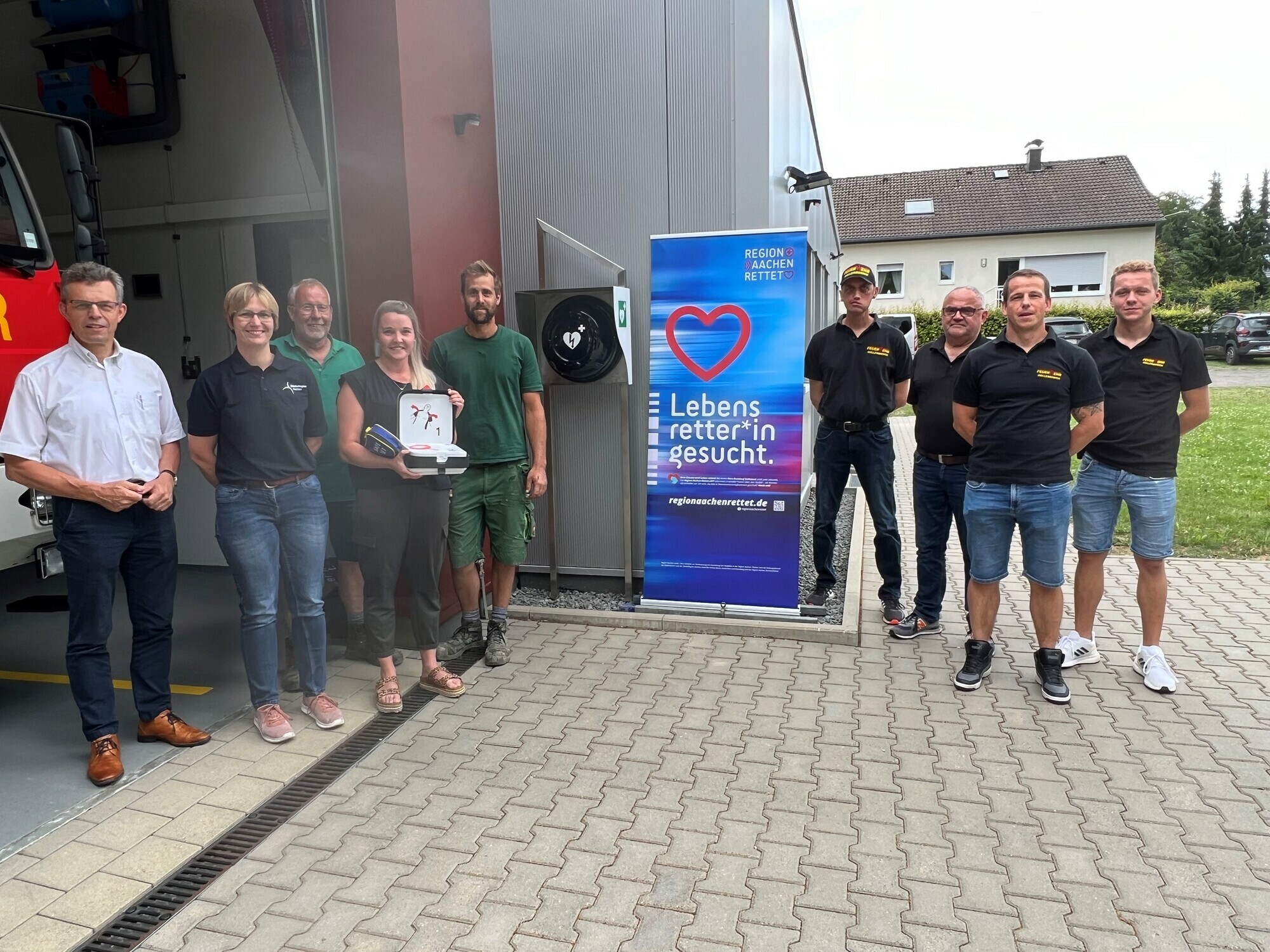 Rollesbroich (Fö). »Wir wollen, dass jeder im Notfall helfen kann«, unterstreicht Laura Löbb. Daher hat sie die Initiative ergriffen und die Anschaffung eines »Automatisierten Externen Defibrillators« (AED) in Rollesbroich auf den Weg gebracht. Gesponsert von »Garten- und Landschaftsbau H. Müller Inh. Toni Heck« und errichtet von den Wehrleuten der Rollesbroicher Löschgruppe steht der AED nun rund um die Uhr am Feuerwehrgerätehaus bereit. »Das Gerät leitet den Ersthelfer bei der Wiederbelebungsmaßnahme an und gibt so Sicherheit mittels klarer Anweisungen«, versichert Kerstin Nagel vom Qualitätsmanagement des Rettungsdienstes in der Städteregion Aachen.