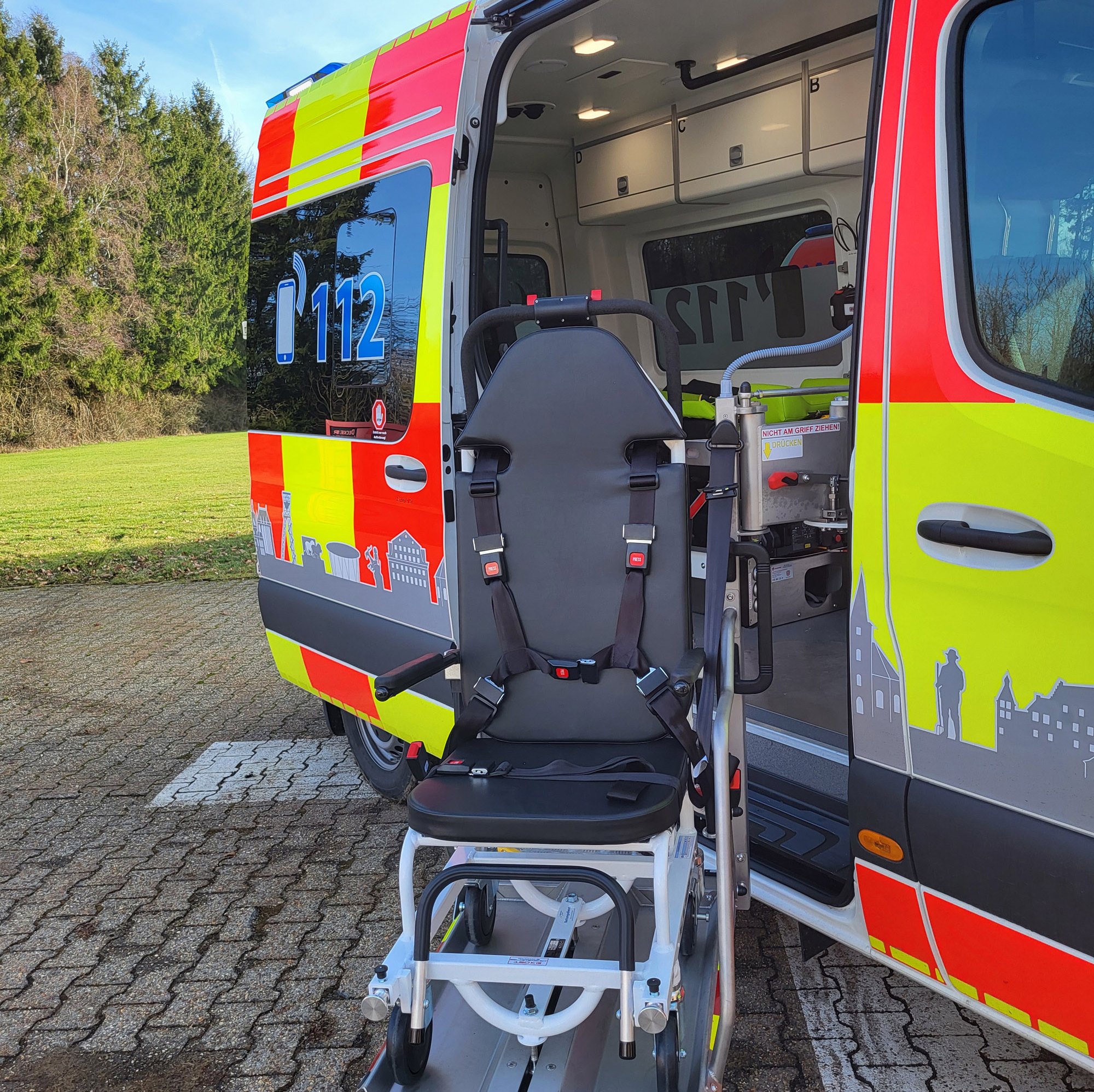 Zur Ausstattung der neuen Fahrzeuge gehören unter anderem eine hydraulische Fahrtrage für ein sicheres Be- und Entladen, ein ergonomischer Tragestuhl mit integriertem Liftsystem zum komfortablen und rückenschonenden Transport und ein kompakter, aber vollwertiger Defibrillator und Patientenmonitor zur medizinischen Überwachung.