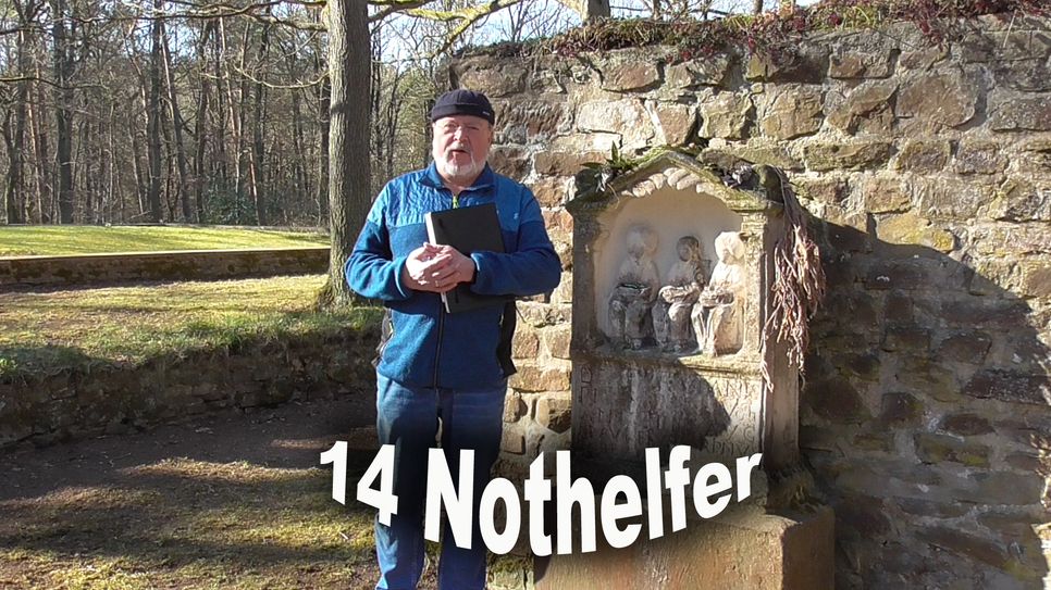 So ruft der Eifeler, der etwas verloren hat, zum Heiligen Antonius. „Dr Hellije Donatus schötz vüer Bletz unn dr Florian jähnt Führ, Christopherus hält ongewähs en Hank över oss, unn dr Sank Mechel kaste schnack für alles ahnkalle“, so Eifeldichter Fritz Koenn. In Berk werden die 14 Nothelfer besonders verehrt. Die Berker Pfarr- ist auch Wallfahrtskirche zu den 14 Nothelfern. Und die haben praktisch für jeden etwas dabei: Achatius hilft bei Todesangst, Ägidius bei der Beichte. Barbara („Bärb“) ist Schutzpatronin der Bergleute und Artilleristen. Blasius hilft bei Halsleiden, Christophorus („Chress-Stoffel“) sorgt für Rettung aus jeglicher Gefahr. Er ist Schutzpatron der Autofahrer und Flößer. Cyriacus gilt als Helfer in der Todesstunde, Dionysius („Dennis“) hilft bei „Koppeng“ und Seelenleiden. Erasmus ist Helfer bei Leibschmerzen, Eustachius steht den Menschen in schwierigen Lebenslagen bei. Georg („Schösch“, „Schorsch“) ist Helfer bei Kriegsgefahren und Beschützer der Pferde. Katharina („Trien“, „Kett“, „Treng“) gilt als Beschützerin der Frauen, Margareta („Jreet“, „Jreetche“) ist Patronin der Gebärenden, Pantaleon der Ärzte und Hebammen und Vitus („Veit“) schließlich Helfer bei Geisteskrankheit. Nach einer „Dööf“ (Tauffeier) und reichlichem Konsum geistiger Getränke kam ein Eifeler nicht mehr aufs Pferd und rief die 14 Nothelfer um Hilfe. Er nahm von Neuem Schwung und landete auf der anderen Seite des Pferderückens im Mist: „Moot Ihr dann all op eemohl komme? Et hääv jereich, wenn zwei oder drei jehollepe häve . . .“