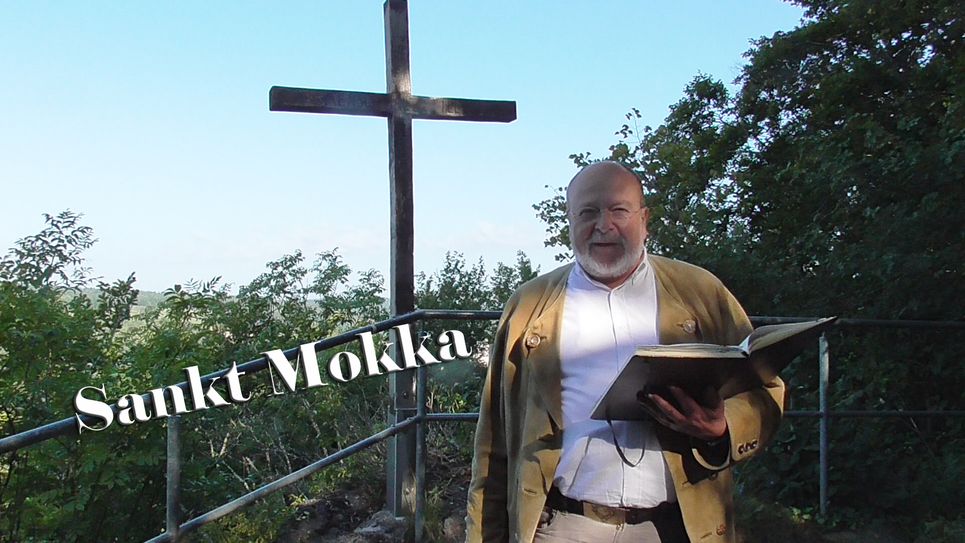 Mokka ist eine Kaffeesorte und die vielen unfreiwillig „Heiligen“, die 1946 bis 1953 geschätzte 1000 Tonnen unverzollten Kaffee über die belgische Grenze schafften, haben eine Menge Geld verdient. Die Kaffeesteuer betrug zehn Mark pro Kilo. Mit dem Erlös wurde u.a. „St. Mokka“ gebaut. Mir schrevven 1945, de Kreesch wohr erömm unn die Mensche stonten fürm Nüühs (Nichts). Schmidt war durch die Schlacht im Hürtgenwald verwüstet, die ahl Kerch St. Hubertus jeng en de „Allerseelenschlacht“ 44 en Trümmer. Not macht erfinderisch: Obwohl 17 Kilometer von Belgien entfernt, stiegen die Schmidter groß ins Kaffeegeschäft ein. Die Schmugglerpfade abseits der „Hoopstrooße“ kann man noch begehen. Kolonnen von Kaffeeträgern, gesichert durch Vorläufer und Seitenläufer mit Signalpfeifen, schleppten pöngels- (bündel-) un „sackwies“ (sackweise) Bohnen heran. Der Job war nicht ungefährlich, 30 Menschen sollen von Zöllnern, die oft aus den gleichen Dörfern stammten, erschossen worden sein. Der Schmidter Pfarrer Josef Bayer hielt Gottesdienste und betete „für die, die noch ongerwähs senn“. Seine Schäfchen konnten beim Schmuggel in einer Woche mehr verdienen, als vor dem Krieg im Jahr. Wohlstand kam auf, Häuser und Höfe entstanden neu, nur Pastuhr hatt kenn Jrosche für seng Kirch. Also predigte Bayer der Gemeinde ins Gewissen: „Ihr hatt Kopp-Peng (Kopfweh) weil Ihr su vell Jeld hatt - unn ich wäje menge Scholde“. Ein anderes Predigtzitat lautet: „Ich bete Nacht für Nacht, dass ihr nicht erwischt werdet, und ihr habt nichts für den Wiederaufbau der Kirche übrig.“ Anderntags lagen 250.000 Mark im Opferstock…