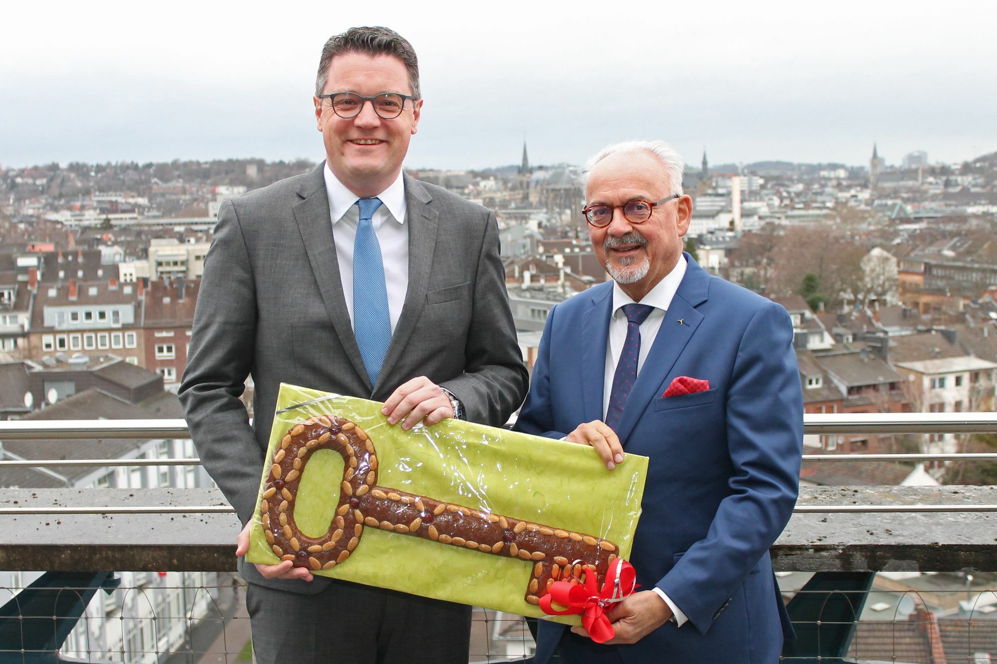 Symbolische Schlüsselübergabe bei der StädteRegion Aachen: Dr. Tim Grüttemeier folgt auf Helmut Etschenberg im Chefsessel über dem Zusammenschluss von zehn Kommunen.
