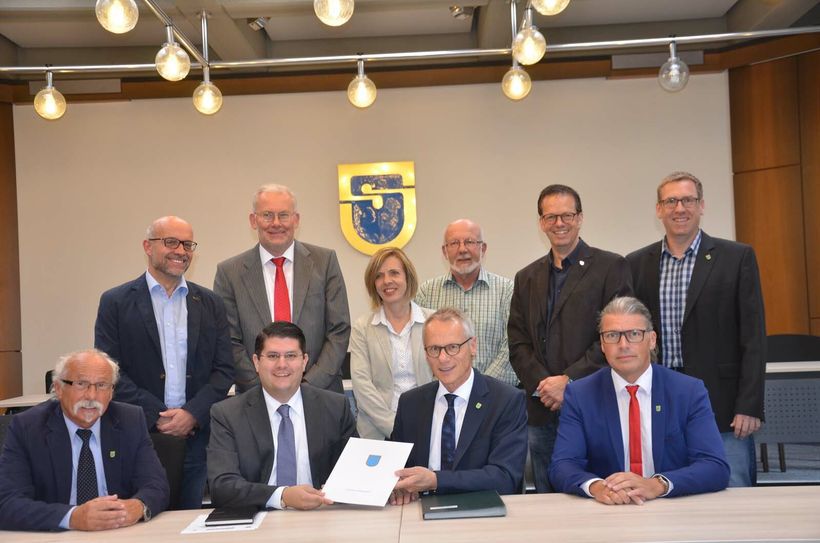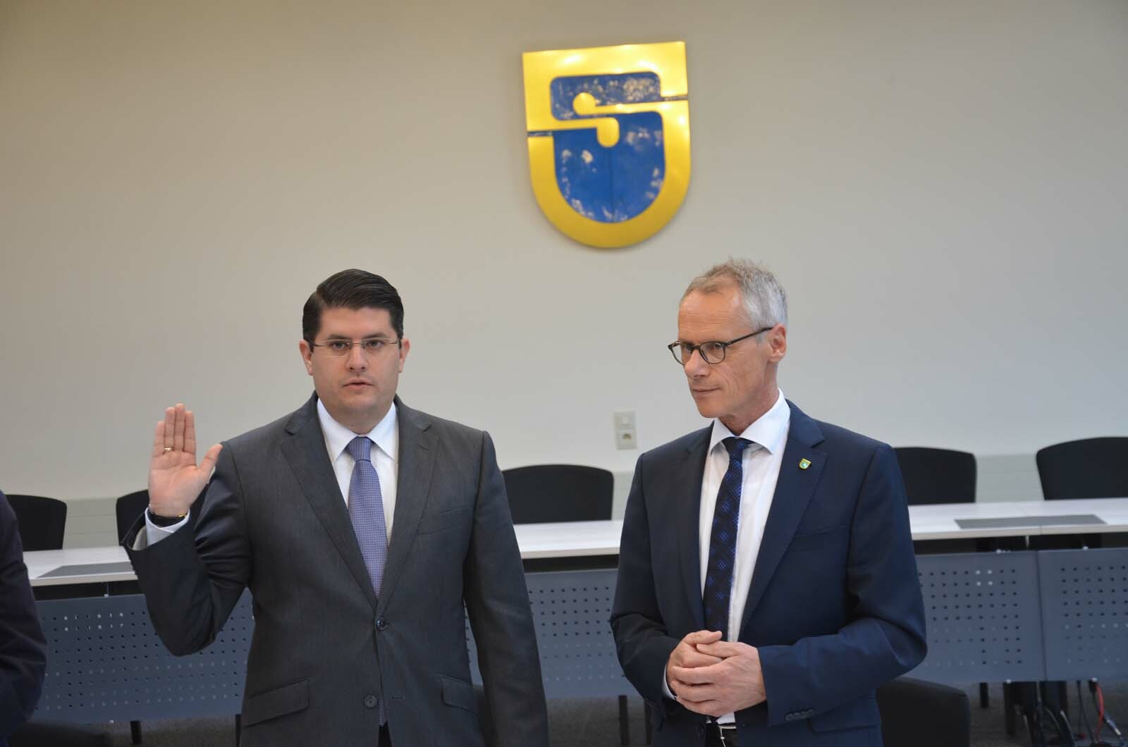Der Gemeinderat votierte einstimmig für ihn und Bürgermeister Karl-Heinz Hermanns hat ihn für anstehende, große Projekte im Visier: Mit Vorschusslorbeeren und einem gut gefüllten Terminkalender startet Bennet Gielen in eine neue berufliche Herausforderung: Beigeordneter der Gemeinde Simmerath. Simmerath (Fö). »Ich betrete Neuland - beruflich wie privat«, stellt der zweite Mann im Simmerather Rathaus bei seiner Amtseinführung fest. »Daher bedanke ich mich für das große Vertrauen der Ratsmitglieder und die herzliche Aufnahme in Ihre Reihen.« Ein wenig Schonfrist und Einarbeitungszeit wird er schon bekommen, doch mit dem 1. Oktober hat Bennet Gielen auch eine Menge Verantwortung übernommen. Gielen: »Diese scheue ich keineswegs, ich freue mich auf interessante und erfolgreiche Projekte im Sinne der Gemeinde und der Bürger, die hier leben.« Mit Verwaltungsarbeit kennt sich der 36-Jährige vom Niederrhein aus. Er studierte Jura, arbeitete im Job-Center des Kreises Viersen. »Eine sehr intensive Zeit, die ich nicht missen möchte«, versichert Gielen. Auch für die Wirtschaftsförderungsgesellschaft in seinem Heimatkreis und den Naturpark Schwalm-Nette hat der gebürtige Niederkrüchtener gewirkt. Schließlich wurde er vier Jahre lang persönlicher Referent des Landrates Peter Ottmann. Nach dessen Ausscheiden fand Gielen im Rechtsamt der Kommunalaufsicht des Kreises Viersen eine neue Herausforderung. 24 Kandidaten Aus dieser Tätigkeit hat ihn nun die Gemeinde Simmerath herauseisen können. 24 Bewerbungen waren bei Karl-Heinz Hermanns eingegangen, nachdem offenkundig wurde, dass Roger Nießen die Nordeifel nach sechs Jahren in Richtung Würselen verlässt. Er konnte nicht nur sämtliche Mitstreiter ausstechen, sondern auch den Gemeinderat überzeugen. »Ein wichtiges Zeichen für eine konstruktive Zusammenarbeit«, nannte Bürgermeister Karl-Heinz Hermanns das einstimmige Votum des Gemeinderates. »Bennet Gielen ist ein engagierter, kompetenter Mann«, freut sich Hermanns auf seinen Stellvertreter im Rathaus. Gemeinsam mit Hauptamtsleiter Manfred Nellessen und Kämmerer Bruno Laschet bilden die Beiden auch den Verwaltungsvorstand. Rückgrat In gemütlicher Runde stellte sich Bennet Gielen dann auch den Fragen der Amtsleiter im Simmerather Rathaus. Fachlich schienen diese gut informiert zu sein, anderes brannte ihnen unter den Nägeln. Zum Leidwesen von Manfred Nellessen, aber auch zur allgemeinen Erheiterung, outete sich der Mann vom Niederrhein als Fan des 1. FC Köln. »Da muss ganz in der Nähe von Mönchengladbach, aber auch in den meisten Spielzeiten ein starkes Rückgrat haben. Aber aktuell läuft es doch - ebenso wie bei mir -sehr gut.« Freund der Eifel Damit er sich so fit hält, wie es für die Kicker seines Lieblingsvereins eine Selbstverständlichkeit ist, bot ihm der zweite stellvertretende Bürgermeister Norbert Brewer (SPD) an, in der Garde der KG Sonnenfunken aktiv zu werden. »Ob Garde das richtige für mich ist, weiß ich nicht. Aber für den Karneval bin ich sehr aufgeschlossen«, skandierte Gielen. Der verheiratete Vater einer zweijährigen Tochter machte auch keinen Hehl daraus, dass er eine weite Anreise zum Arbeitsplatz vor sich habe. »Meine Frau ist ebenfalls Juristin und in Teilzeit berufstätig. Dennoch wollen wir mittelfristig auch unseren privaten Lebensmittelpunkt in die Eifel verlagern«, erklärt Gielen. Die Region kennt der Jurist aus Kurzurlauben mit seiner Familie. Die Monschauer Altstadt hat es ihm genauso angetan wie der Rursee. Und einen Abstecher in den Nationalpark Eifel will er schon bald unternehmen. Dass Bennet Gielen zu höheren Ämtern bereit ist, zeigte sich bereits im vergangenen Jahr. Da hatte er sich als CDU-Kandidat dem Votum der Wähler um das Bürgermeisteramt in Niederkrüchten gestellt - und verloren. Was nicht ist, kann ja noch werden, wird für den Beigeordneten der Gemeinde Simmerath diese Tätigkeit sicherlich nicht die letzte Sprosse auf der politischen Karriereleiter sein.
