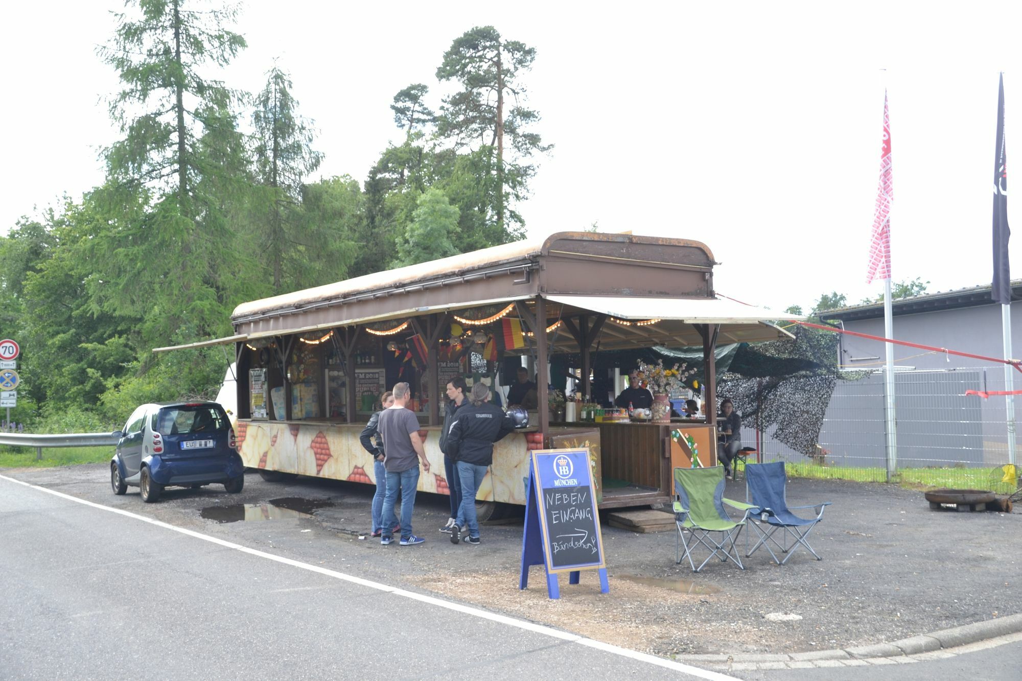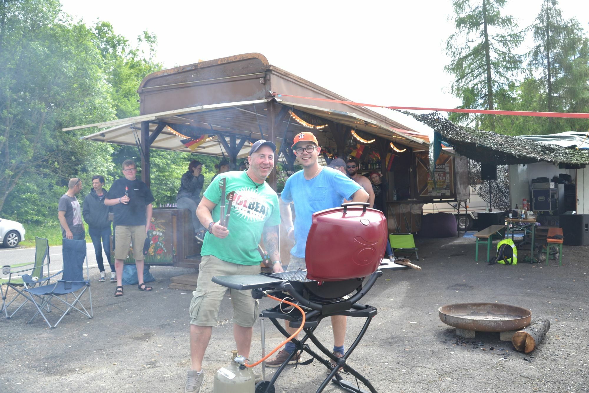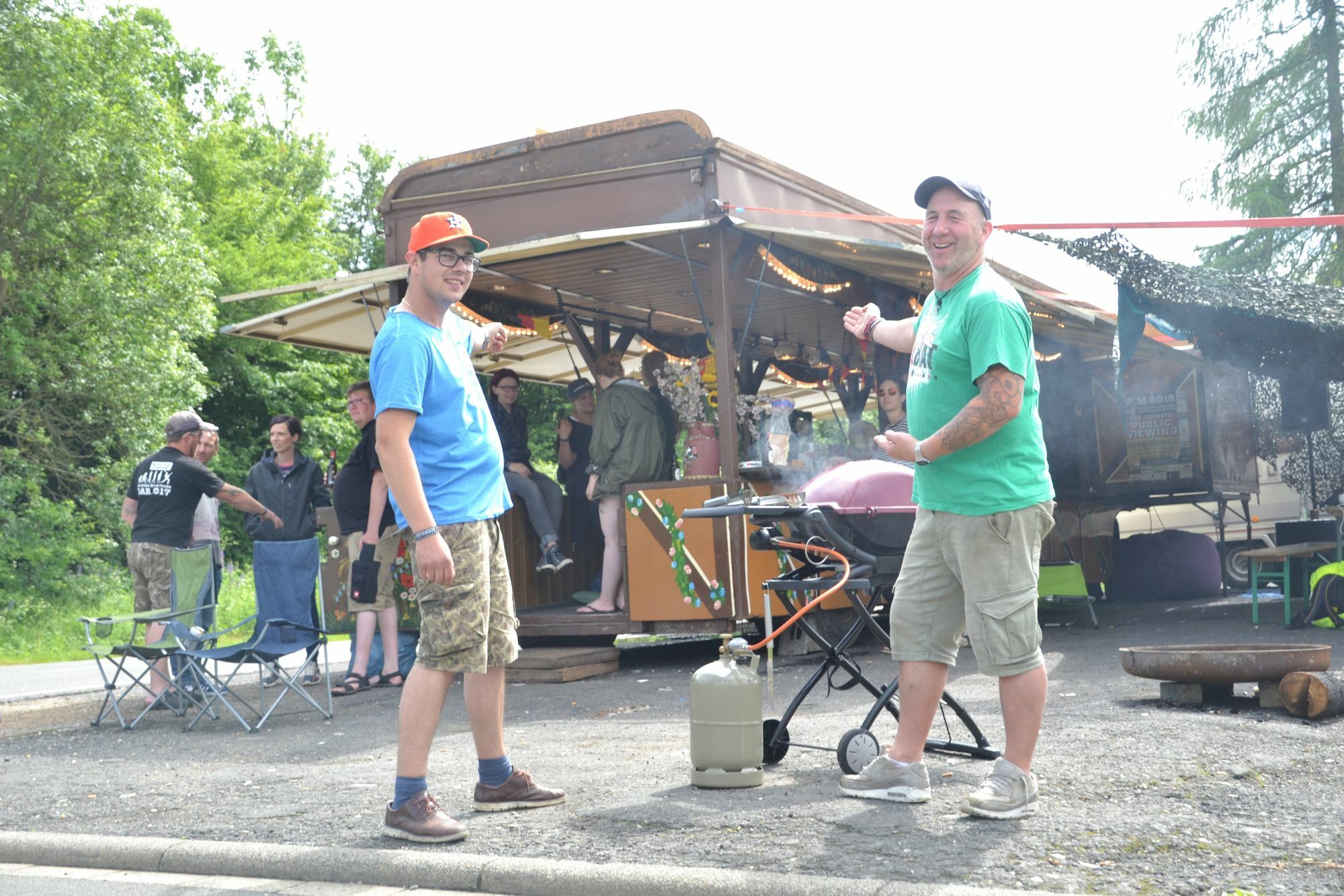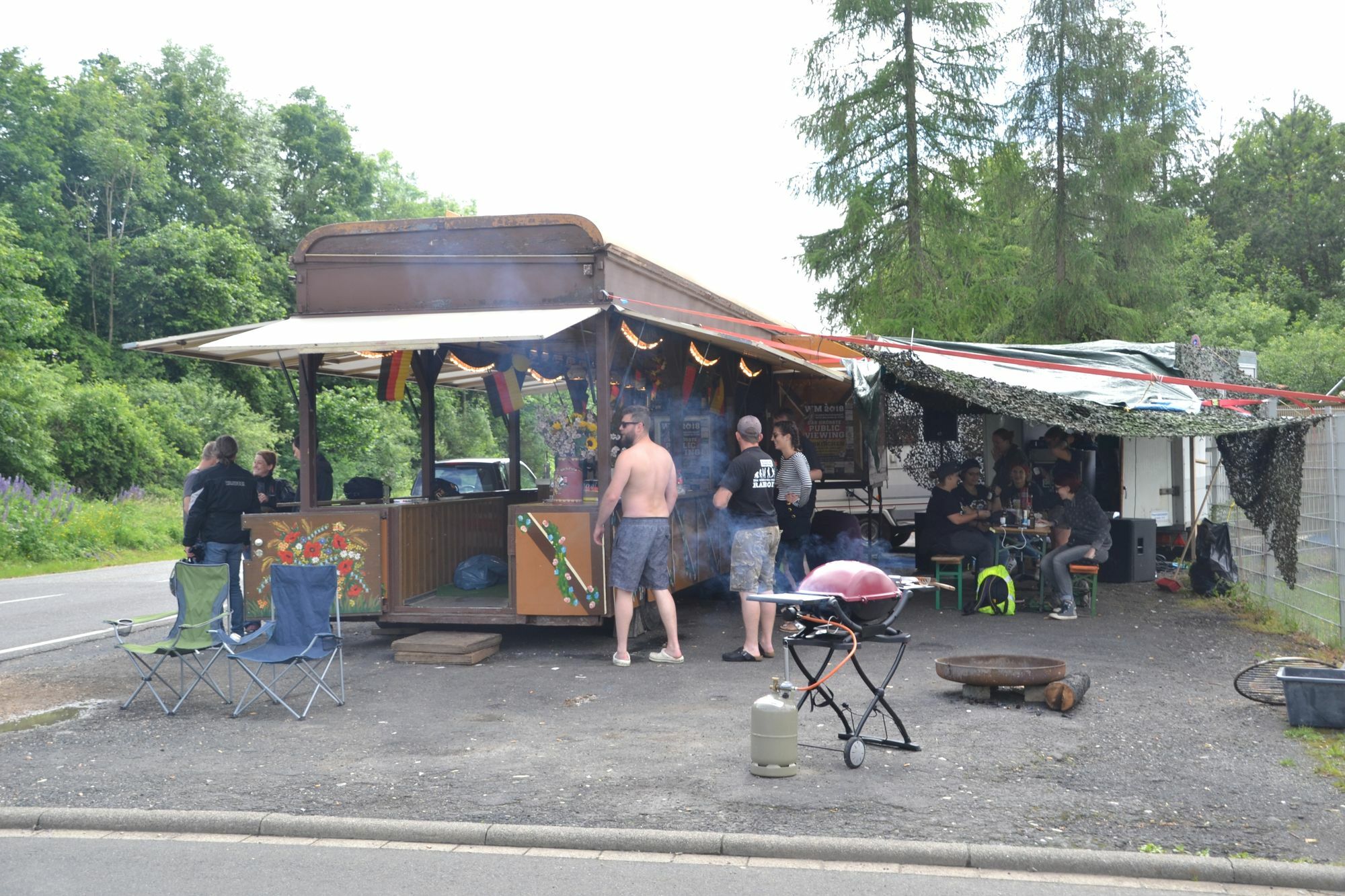 Jupp ist zum ersten Mal bei Rock am Ring. Und das, obwohl er nicht mehr der jüngste ist. Aber er schlägt sich wacker. Und er ist ein gerne gesehener Gast. Groß gefragt wurde er nicht, ob er mitwill. Stefan Rhiem hat ihn einfach mitgenommen. Jupp ist ein alter Kirmes-Schankwagen, steht direkt vor dem ADAC Fahrsicherheitszentrum am Nürburgring und war ein Spontankauf. „Ich bin bei einem Händler für gebrauchte Nutzfahrzeuge angestellt. Ich war auf einer Auktion und wollte eigentlich was anderes kaufen“, erzählt Stefan Rhiem. Doch dann wurde der alte Schankwagen angeboten. Der Bürvenicher schlug sofort zu und nahm den Anhänger für 1000 Euro mit nach Hause. „Die Idee war sofort, damit zu Rock am Ring zu fahren“, ergänzt Marc Fühling aus Schwerfen. Er hat seinen Anhänger direkt neben Jupp positioniert und sorgt für die Musik. Gegrilltes und viele Gäste Den Platz vor den Anhängern haben die beiden mit überdachten Biertischen und –bänken gefüllt. Klar, der obligatorische Grill darf auch nicht fehlen. Und so ist Jupp Anlaufstelle für Freunde aus der Heimat, aber auch langjährige Rock-am-Ring-Weggefährten. Man kennt sich. Auch Festivalbesucher, die den Wagen auf dem Weg vom Campingplatz zum Festivalgelände passieren, machen gerne Station. „Wer mag, bekommt ein Bier“, sagt Fühling. Und jeder gibt dafür einen finanziellen Obolus, den er für angemessen hält. „Wir wollen damit ja keinen Gewinn machen“, sagt Fühling. Auch die Ordner, die einige Meter weiter an der Einmündung der L 93 in die B 258 ihren Dienst versehen, werden mit Nahrung versorgt. „Die haben morgens nach einem Kaffee gefragt, aber den konnten wir ihnen leider nicht bieten“, bedauert Marc Fühling. Also soll Jupp künftig um eine Kaffeemaschine ergänzt werden. Gäste des ADAC Fahrsicherheitszentrums Marc Fühling und Stefan Rhiem sind Gäste des ADAC Fahrsicherheitszentrum. Jupp steht zwar direkt vor dem Zaun des Zentrums, doch gehört der Bereich noch zum Grundstück des Zentrums. Die Gäste bekommen sogar Strom und Wasser gestellt. Darum kümmert sich Mitarbeiter Thorsten Kessler. Er und Geschäftsführerin Petra Diederich sind froh, dass Rhiem, Fühling und auch die benachbarte Campinggruppe, die schon seit vielen Jahren dabei ist, direkt vor der Tür ihre Lager aufschlagen. Denn so wissen sie, dass alles mit rechten Dingen zugeht und sich keine Unbekannten dort niederlassen, die für Chaos sorgen. „Es gab nämlich Jahre, da brauchten wir Personal zum Absperren“, erinnert sich Kessler. Seinen neuen Platz hat Jupp von einer Gruppe aus Mannheim übernommen. „Aber die Mitglieder sind jetzt zu alt zum Campen und übernachten im Hotel“, verrät Fühling schmunzelnd. Natürlich kommen sie trotzdem auf einen Plausch an ihrem alten Standort vorbei. In den kommenden Wochen wird Jupp schick gemacht. Stefan Rhiem hat bereits Pläne, wie er dann aussehen soll. Eine nagelneue Schankanlage ist schon eingebaut. Und dann soll der Wagen auch zu mieten sein – inklusive Marc Fühling alias DJ Fötus. Zwei große Brauereien und eine Winzergenossenschaft aus dem Kreis Ahrweiler hat Rhiem bereits mit ins Boot geholt. Seinen nächsten Einsatz bestreitet Jupp übrigens beim Public Viewing zur Fußballweltmeisterschaft auf dem Platz am Gardebrunnen in Euskirchen.