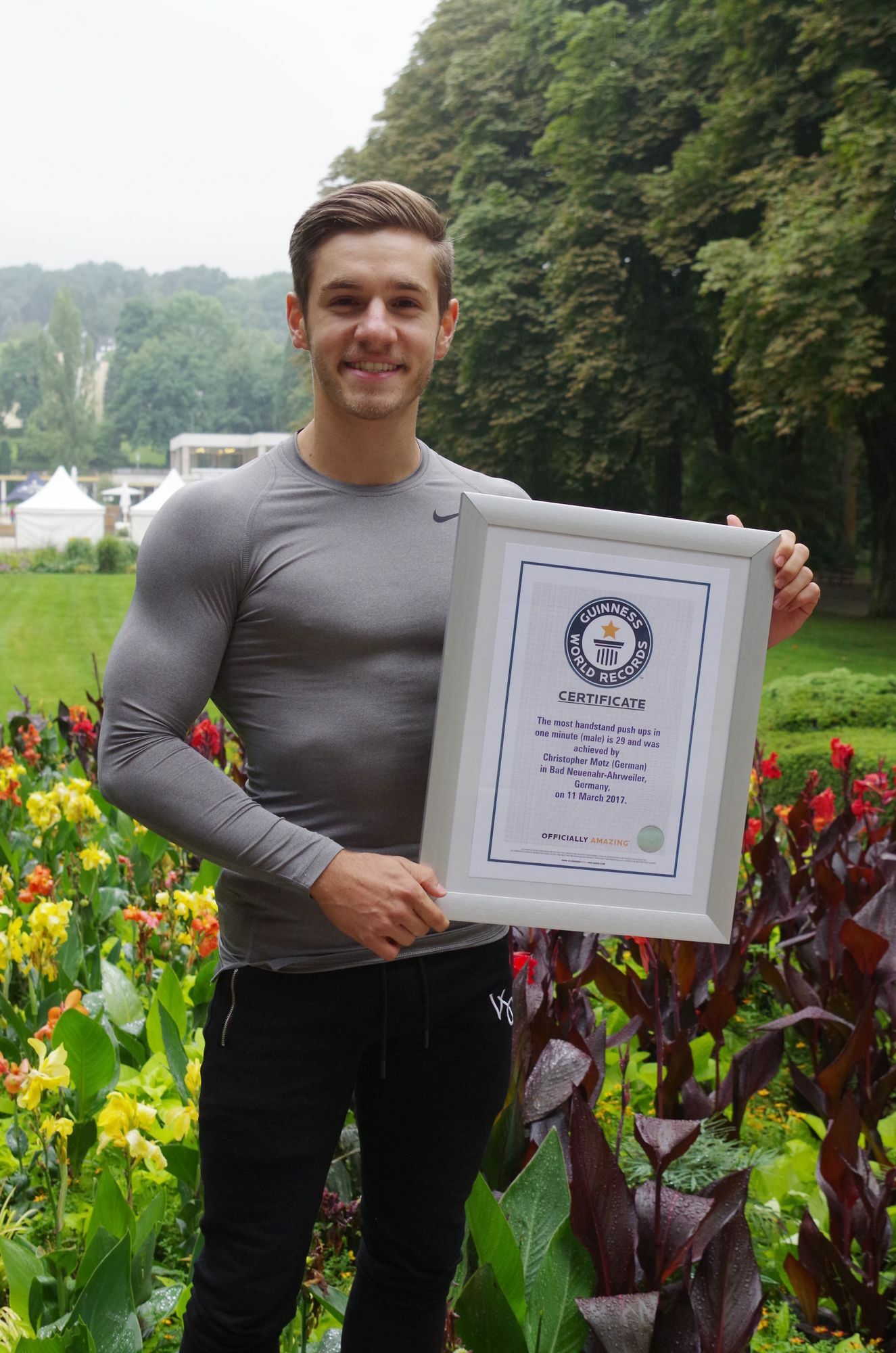 Seit seiner Kindheit turnt der 21-Jährige. Er ging für den TV 08 Heppingen als Turner und Mehrkämpfer und als Sprinter sowohl für den TuS Ahrweiler und die LG Kreis Ahrweiler an den Start. »Am Ende des Turntrainings machen wir immer etwas Krafttraining«, erzählt er. Dabei kam den Sportlern die Idee, einmal Liegestütz, sogenannte Push-ups, im Handstand zu probieren. Das war vor etwa sechs Jahren. Mit der Zeit stellte sich heraus, dass Christopher Motz diese Übung richtig gut liegt. Er schaffte immer mehr Handstand-Push-ups. »Meine Freunde konnten es schon langsam nicht mehr glauben«, erzählt Motz schmunzelnd. Irgendwann kam aus dem Kreis der Mitsportler die Frage, ob es für dafür bereits einen Weltrekord gebe und wo der denn liege. »Ich habe daraufhin auf Youtube nach Videos gesucht«, berichtet der Weltrekordler. Bei seinen Recherchen stieß er tatsächlich auf einen Armenier, der im Oktober 2015 einen Guiness World Rekord mit 27 Wiederholungen aufgestellt hatte.