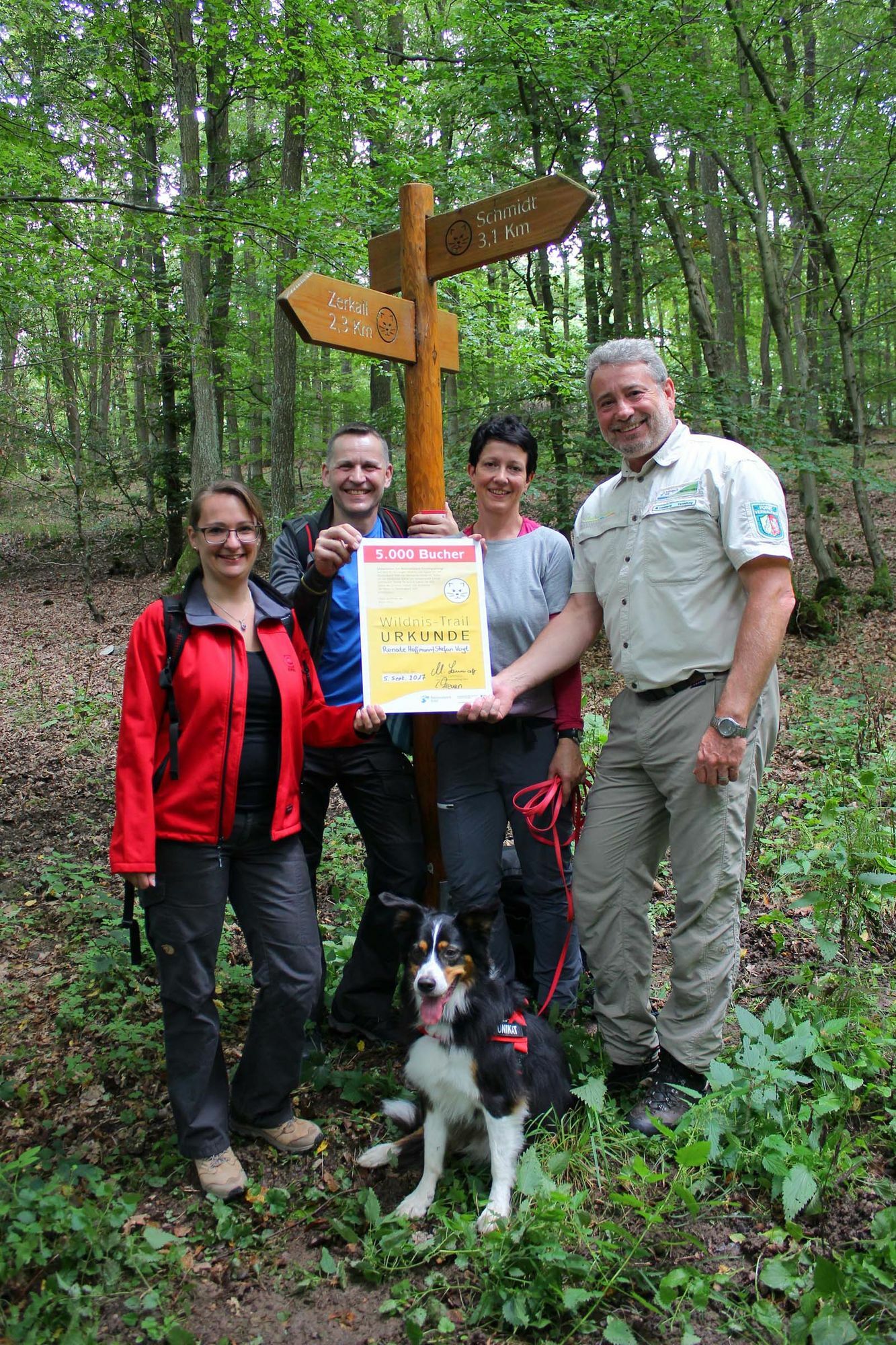 Zusammen mit Cornelia Freuen, verantwortlich für die Buchung des Arrangements bei der Monschauer Land Touristik, überraschte Michael Lammertz, stellvertretender Leiter der Nationalparkverwaltung Eifel und Initiator des Wildnis-Trails, die beiden Wanderer auf der letzten Etappe zwischen Heimbach und Hürtgenwald-Zerkall – wenige Kilometer vor dem Ziel, das gleichzeitig das Ende des Trails markiert. Neben einer Urkunde freute sich das Paar noch zwei Gutscheine für die Erlebnisausstellung „Wildnis(t)räume“ im Nationalpark-Zentrum Eifel. So runden die Beiden ihren Aufenthalt in der Region mit einem Highlight ab, bevor es weiter an die niederländische Nordsee geht.