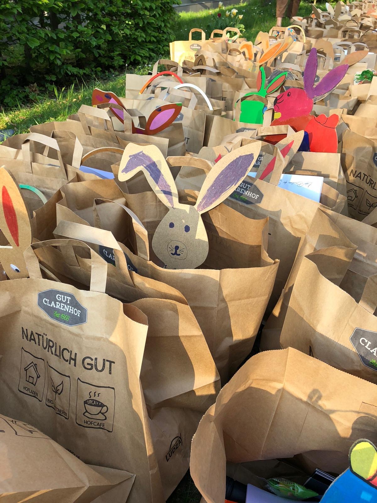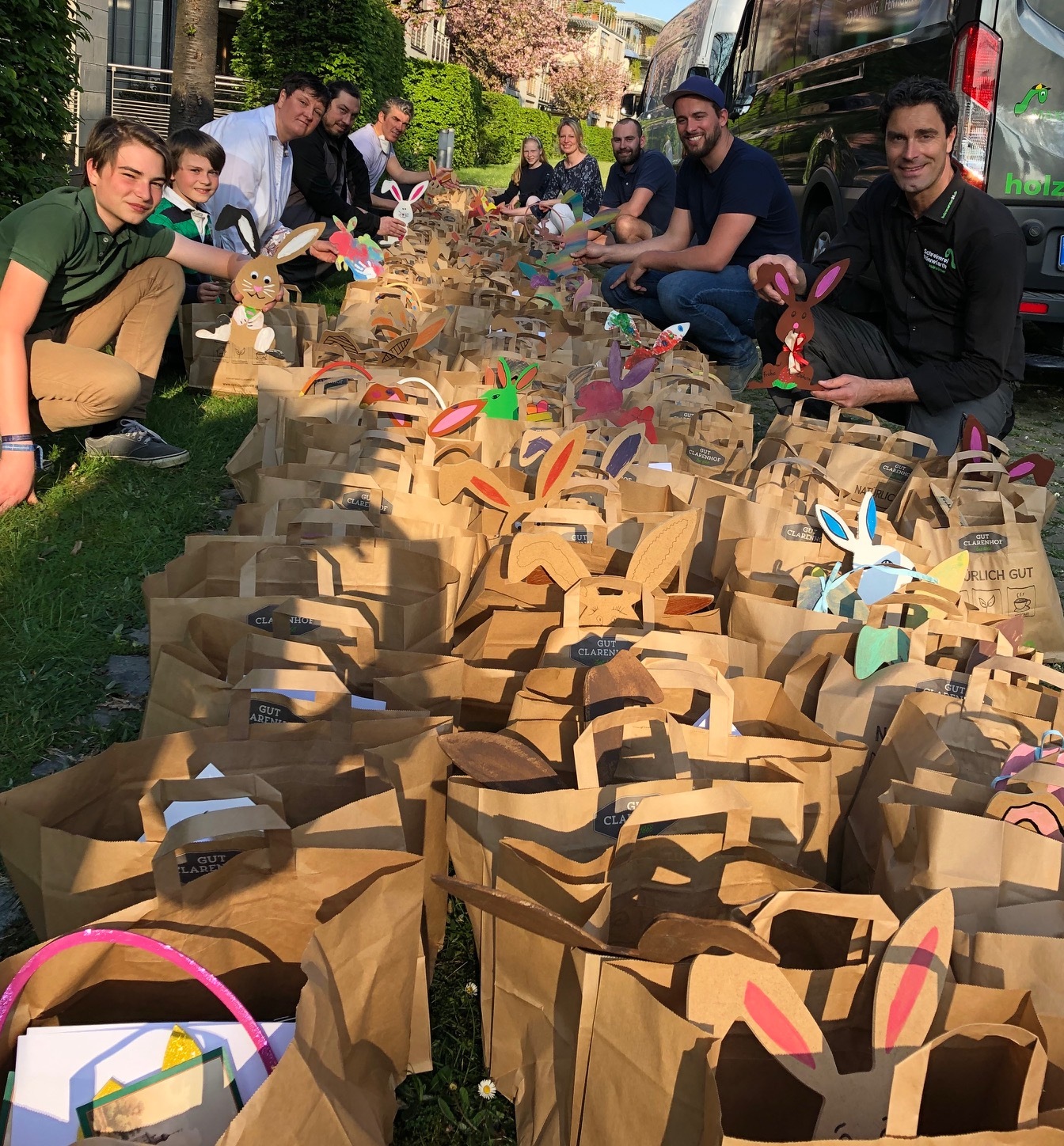 Mit Martin Becker, der die Kölner Schwimmschule Sharky betreibt, entstand eine ganz besondere Aktion aus der Kiste heraus. Kinder konnten die bemalten Hasen zurückbringen und erhielten dafür eine Überraschungstüte sowie einen neuen Hasen. Die bemalten Hasen wurden mit anderen Dingen zu kleinen Osteressen gepackt. "Dabei hat uns auch die Winzergenossenschaft Mayschoss-Altenahr mit Wein unterstützt", berichtet Rönnefarth. Die Tüten wurden am Karsamstag in einem Bensberger Seniorenheim verteilt. "Das war herzergreifend. Wir haben ja nicht irgendwas verteilt, sondern das war schließlich extra für die Senioren gemalt", berichtet Mail Rönnefarth.