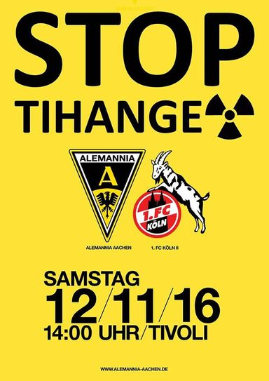 Karten für das Heimspiel gegen werden zum Einheitspreis von 5 Euro angeboten. Die Erlöse aus dem Ticketverkauf werden abzüglich der spieltagsbezogenen Kosten an die grenzüberschreitende Initiative »Stop Tihange« gespendet. Auch allen Partnern, Unternehmen sowie Interessierten ermöglicht die Alemannia ebenfalls aktiv ein Zeichen zu setzen, Karten zu ordern und öffentlich Solidarität gegen den Pannenreaktor zu zeigen. Und auf der Homepage wurde der »Ticketzähler« aktiviert. Der WochenSpiegel verlost 100 Eintrittskarten für das Regionalliga-Spiel im Zeichen des Protests gegen Tihange. Schicken Sie eine E-Mail an gewinnspiel@weiss-verlag.de oder eine Postkarte an WochenSpiegel, Stichwort: Stop Tihange, Postfach 30, 52153 Monschau