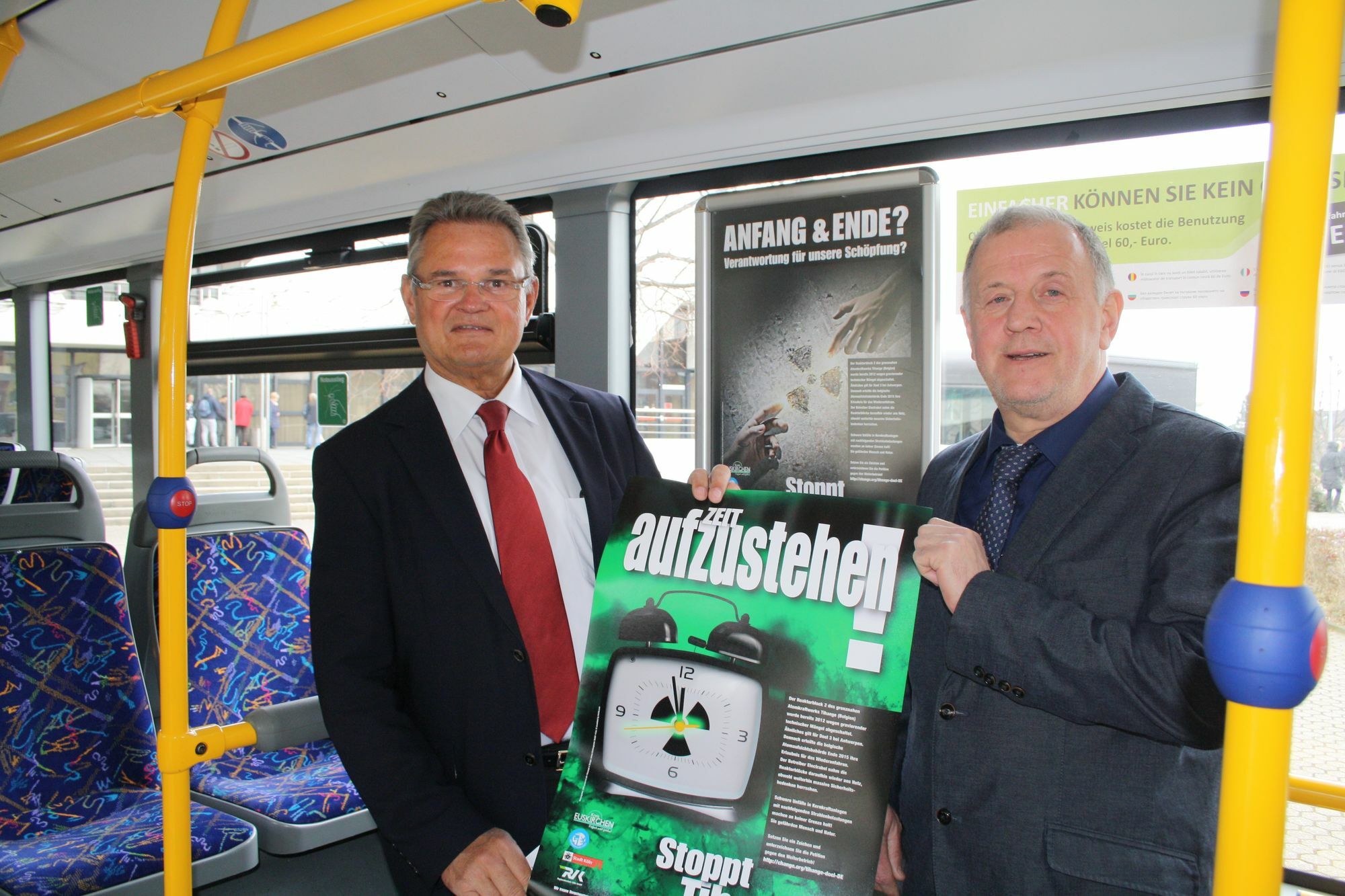 »Auf diesem Weg erreichen wir Tag für Tag viele tausend Menschen«, so Landrat Rosenke. Für ihn sei es logisch, neben juristischen und politischen Initiativen alle weiteren Möglichkeiten zu nutzen und auch kommunale Unternehmen einzubinden. »Die RVK engagiert sich im Klima- und Umweltschutz«, wies RVK-Geschäftsführer Eugen Puderbach, dass der Fuhrpark seines Unternehmens durch Fahrzeuge mit umweltfreundlichen Antrieben erneuert werde. Ab 2030 sollen dann ausschließlich emissionsfreie Busse angeschafft werden. »Aber was nützt es, wenn wir uns für die Umwelt engagieren und dabei Zustände tolerieren, durch die Millionen Menschen gefährdet sind«, meint Eugen Puderbach mit Blick auf die Pannenreaktoren im benachbarten Belgien.