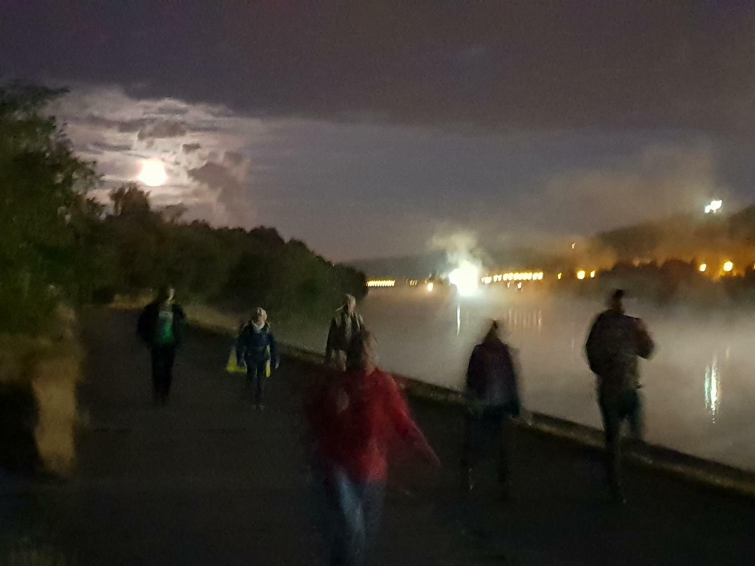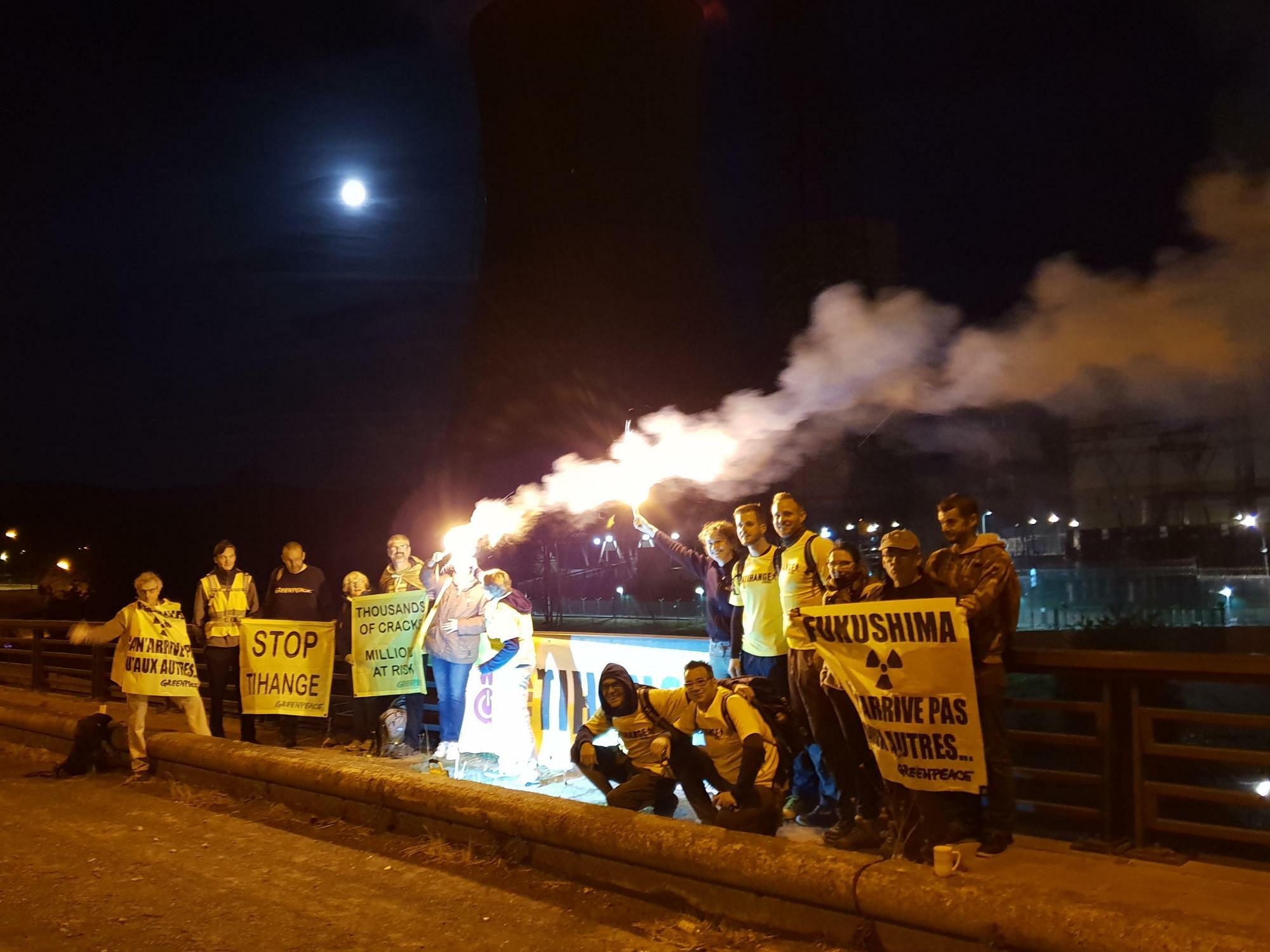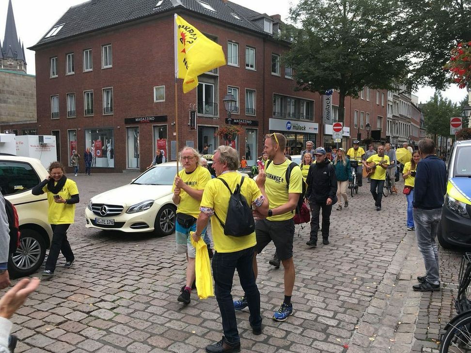 Die Tour begann noch in dunkler Nacht um 04:00 Uhr. Mitglieder vom AAA hatten sie mitten auf die Brücke vor dem AKW-Tihange gebracht. Dort warteten zwanzig belgische AKW-Gegner. Man versammelte sich vor dem Transparent „Walk-OFF-Tihange“ für das Startfoto. Im Hintergrund stand der klare Vollmond und die gespenstische Kulisse der Kühltürme. Das Startzeichen für die Wanderung waren gelbe Bengalos – und ab ging die Tour der Zwei in Begleitung von elf Mitmarschierern entlang der Maas in Richtung Lüttich. Die Gruppe erreichte um 9:00 Uhr den geplanten Zwischenstopp in Lüttich Guillemins. Dort warteten schon 40 AKW-Gegner von Eccolo, Fin de Nucleaire, Greenpeace Belgium, Nucléaire Stop Kernenergie (NSK) und ein TV-Team von RTL. In der Pause wechselte die Begleitgruppe. Dann ging es weiter nach Herve. Dort wurde die Gruppe unter anderem von Greenpeace Belgium und dem AAA erwartet und auf den folgenden Kilometern bis in die Deutschsprachige Gemeinschaft begleitet. In Kelmis nahe der deutsch-belgischen Grenze standen über 60 Menschen Spalier, um die Laufgruppe dort mit Transparenten, Musik und Gesang zu empfangen. Nach der Pause wurden auch hier die beiden Wanderer durch eine neue Gruppe begleitet. Pünktlich um 18:45 erreichte der Walk-OFF-Tihange das Ziel am Marktplatz in Aachen. Dort hatte das AAA ein kleines Fest organisiert. Es wurde gratuliert, es wurde geredet. Natürlich wurde die Gefährdung durch den Risse-Reaktor erwähnt. Walter Schumacher vom AAA ging insbesondere auf die aktuelle Diskussion über die behauptete „Sicherheit von Tihange“ ein: „Tihange-2 hat tausende Risse von einer unklaren Herkunft, die überall sonst in Europa zur dauerhaften Stilllegung des Reaktors geführt hätten. Wir können nur ganz stark hoffen, dass es uns erspart bleibt, dass wir „Recht“ hatten ... “ Auch im belgischen Redebeitrag von Leo Tubbax (NSK) wurden die Probleme der Reaktoren in Tihange benannt. Und Tubbax bat ausdrücklich die deutsche Anti-Atombewegung um weitere Unterstützung beim Kampf um die Abschaltung der belgischen AKWs. Schließlich wurde noch ein „Wanderpokal“ durch den Aachener Langstreckenläufer Mussa Hudrog überreicht. Er lobte die politische Intention der beiden Walker. Für die beiden Läufer dankte Mertens und betonte nochmal ausdrücklich den politischen Charakter ihres Walks: "Wir sind heute durch einen Teil der Region gelaufen, für die der marode Reaktor Tihange 2 ein Risiko darstellt. Tihange ist von Lüttich nur 25 km Luftlinie entfernt. Bis Maastricht sind es nur 47 km und bis zum Aachener Stadtzentrum nur 64 km Luftlinie. Die Sorgen der Menschen in den Niederlanden, in Deutschland und in Belgien müssen endlich ernstgenommen werden!"