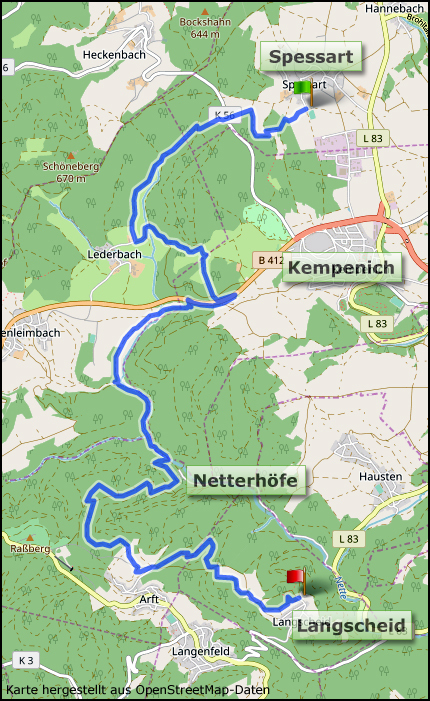 Die 1. Etappe des „EifelNetteSteigs“ ist 15,9 km lang und führt von Spessart bis Langscheid; die Höhendifferenz beträgt 400 Hm. Unterwegs gibt es keine Einkehrmöglichkeit, aber viele Bänke sind an wunderschönen Aussichtsplätzen aufgestellt. Wer die Rundwanderung wählt, muss sich auf 15,7 km und 350 Höhenmeter einstellen.