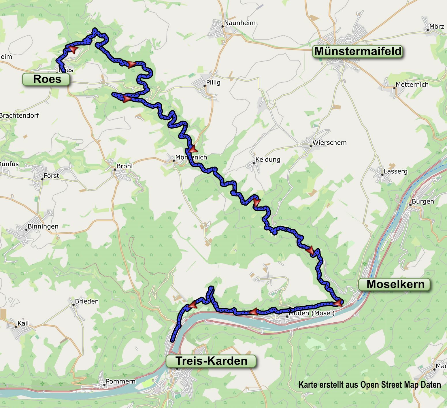 Bis zur Burg Pyrmont gehen wir fast ausschließlich auf schmalen Pfaden, die abwechselnd direkt am Elzbach und weiter entfernt davon verlaufen. Wir wandern in ständigem Auf und Ab überwiegend durch Wald, aber immer wieder öffnet sich die Landschaft, und wir blicken auf den Bach unter uns, auf die gegenüberliegenden Wälder und Höhen oder eine Auenlandschaft. Mehrfach wird der Elzbach auf kleinen Brücken überquert und auch die Bezeichnung „Felsensteig“ kommt zwischendurch zu ihrem Recht. Immer wieder finden sich Bänke und Rastplätze an ausgesucht schönen Stellen. Auch der Weiterweg ist reizvoll. Es geht von der Burg Pyrmont abwärts ins Tal des Wahlbachs und zur Pyrmonter Mühle und schließlich wieder zum Elzbach und bis zur Burg Eltz (herrlicher Blick auf die Burg!). Weiter geht es bis kurz vor die Ringelsteiner Mühle, dann wieder aufwärts durch Wald, bis sich plötzlich – ein atemberaubender Blick ganz anderer Art – das Moseltal vor uns öffnet.