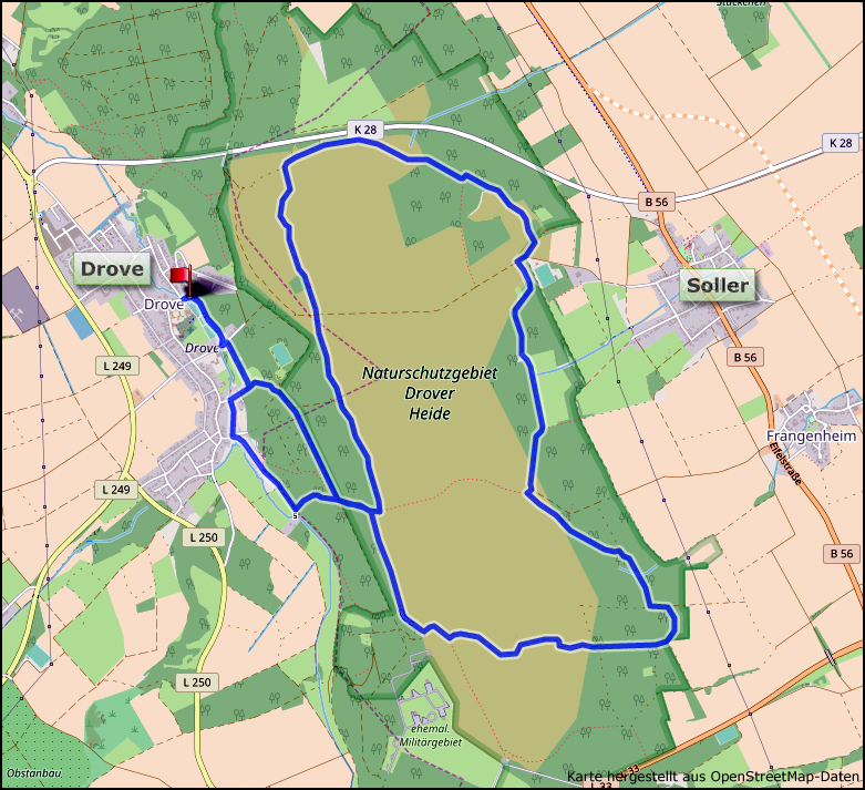 Bereits der Einstieg in Drove ist ein Genuss: Wir durchqueren entlang des Drover Bachs das „Nachtigallental“, anschließend ein Waldstück und kommen schnell in das eigentliche Heidegebiet. Dieses umrunden wir gegen den Uhrzeigersinn auf überwiegend unbefestigten Wegen und Pfaden, über Holzstege, wie wir sie vom Venn kennen, und auf herrlichen Graswegen. Mal geht es durch Wald, mal durch offene Heide- und Wiesenlandschaften, die mit Birken, Eichen und Sträuchern durchsetzt sind. Vor allem im zweiten Streckenabschnitt bringen die zahlreichen Tümpel zusätzlich „Leben“ in die Wanderung. Wer sich Zeit nimmt, kann auch ohne biologische Kenntnisse faszinierende Beobachtungen machen. Ein Höhepunkt im doppelten Sinn ist gegen Schluss der Runde der Aussichtshügel, der trotz seiner geringen Höhe einen imponierenden Panoramablick auf die Heide bietet.