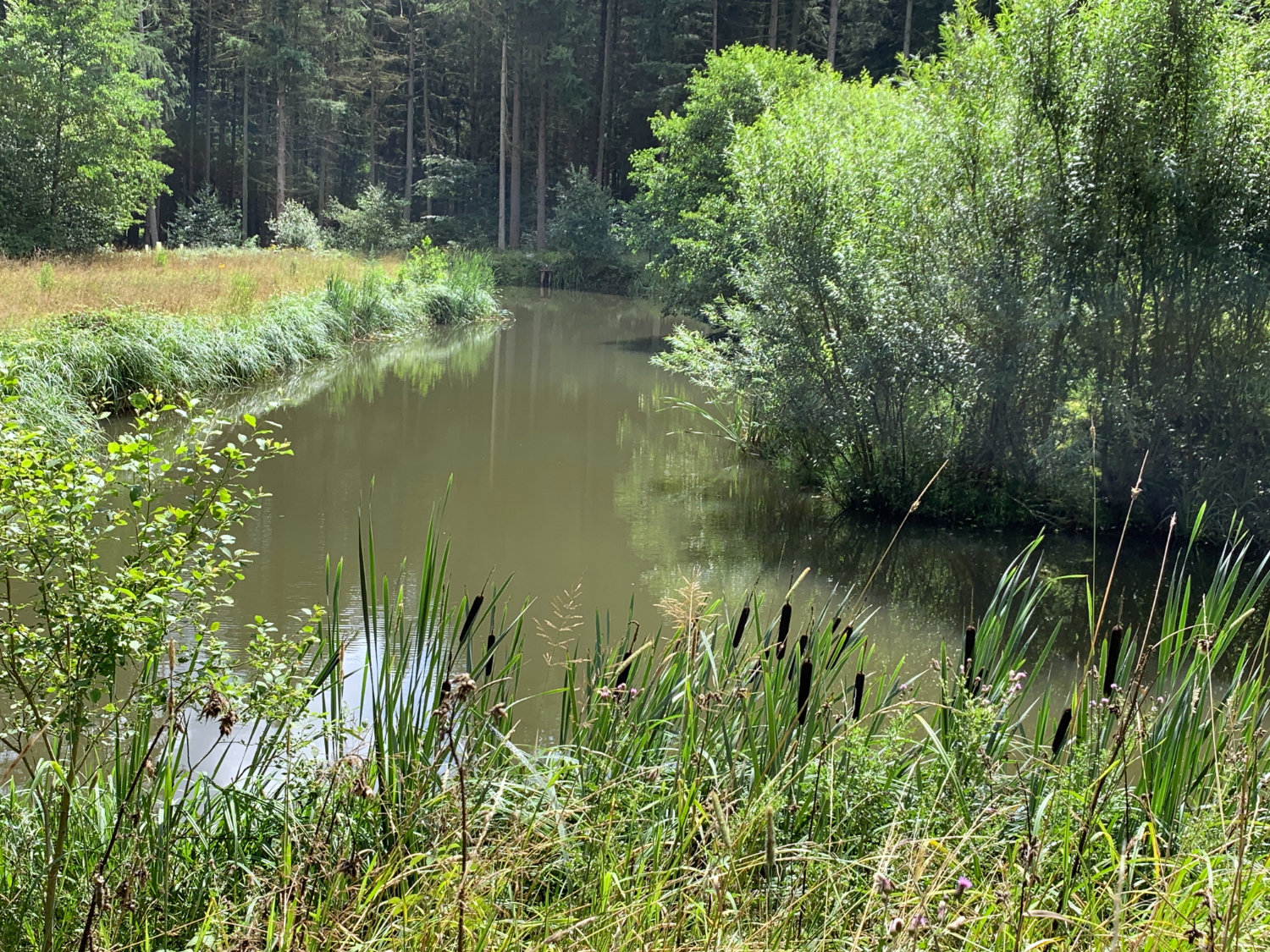 Der Parkplatz in Soller liegt recht hoch, so erhalten wir schon nach wenigen Metern herrliche Weitblicke über die Hochfläche der Mutscheid in Richtung Nürburg und Hohe Acht. Weiter geht es in Auf und Ab, aber ohne erhebliche Höhenunterschiede über diese einsame Fläche im Naturpark Hohes Venn-Eifel, und nur aus der Ferne nehmen wir die eine oder andere Ansiedlung wahr. Anschließend wechseln wir Richtung NO, passieren das Gut Hospelt und steigen tief hinunter zum Liersbach. Längere Zeit wandern wir bachaufwärts und genießen das Mäandern des Bächleins. Wie im Märchen taucht plötzlich ein einsamer Weiher mit üppigem Uferbewuchs auf, dahinter gehen wir auf der anderen Bachseite, nun auf einer Höhe mit dem Gewässer, weiter taleinwärts. Auch hier reiche Flora und nichts als Einsamkeit und Stille. Vor der Bühlerlochsmühle biegen wir links ab, verlassen das Tal und steigen auf Graswegen und durch eine weite Wiesenlandschaft hinauf nach Hummerzheim, anschließend noch einmal tief hinunter in ein Bachtal. Bald dahinter queren wir ein weiteres Wiesen-Idyll, ehe uns ein letzter Anstieg nach Soller bringt.