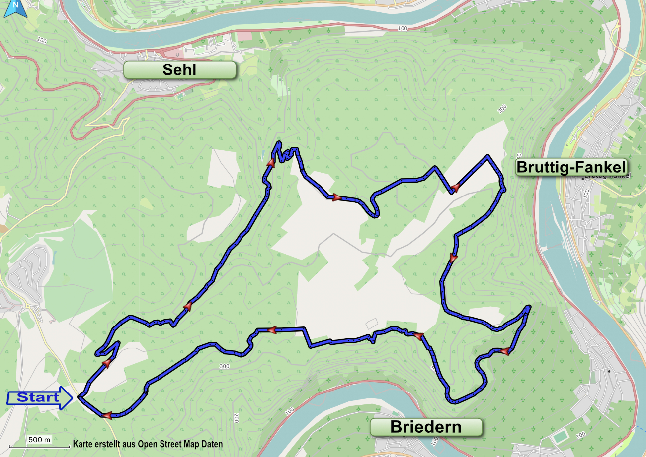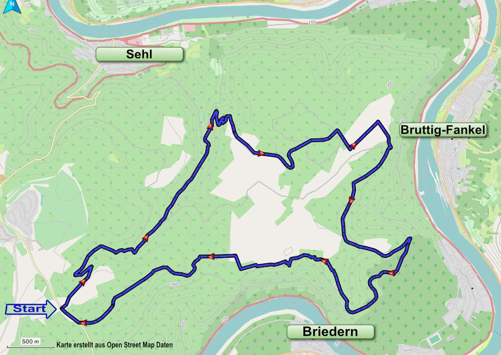 Ein kurzer Zuweg führt vom Parkplatz am Golfresort zum Beginn der eigentlichen Runde; schnell gelangen wir von dort zum Ebernacher Bach und wandern längere Zeit abwärts durch das immer tiefer eingeschnittene Tal, zuletzt direkt am Bach. Umgestürzte, durcheinander liegende und mit Moos bewachsene Bäume – einige davon liegen auf dem Weg und müssen überstiegen werden – erinnern an einen unberührten Naturpark. Es folgt ein Anstieg zurück auf die Höhe und in offenes Gelände mit Streuobstwiesen. Reizvoll die Querung des Kraklebachs an einer auffälligen Eichengruppe und einem versteckt liegenden Weiher mit Rohrkolben. Auf einer weiten Wiesenfläche sind im Hintergrund schon die Hunsrück-Höhen zu erkennen, und kurz danach erreichen wir eine Rasthütte mit herrlichem Mosel-Panorama und bewundern die Moselschleife bei Bruttig-Fankel, die Hunsrück-Höhen gegenüber und in der Ferne Beilstein mit der Burgruine Metternich.