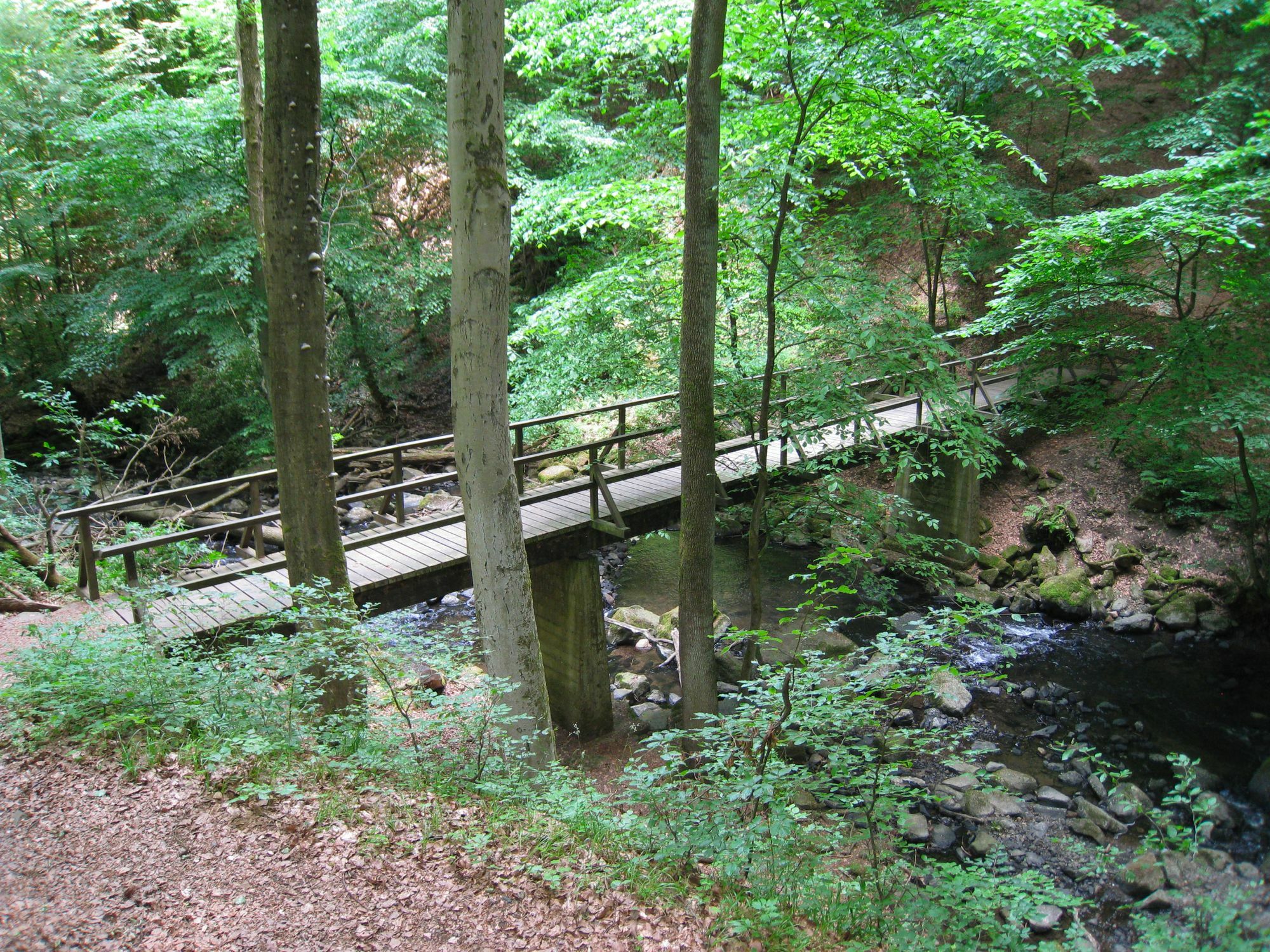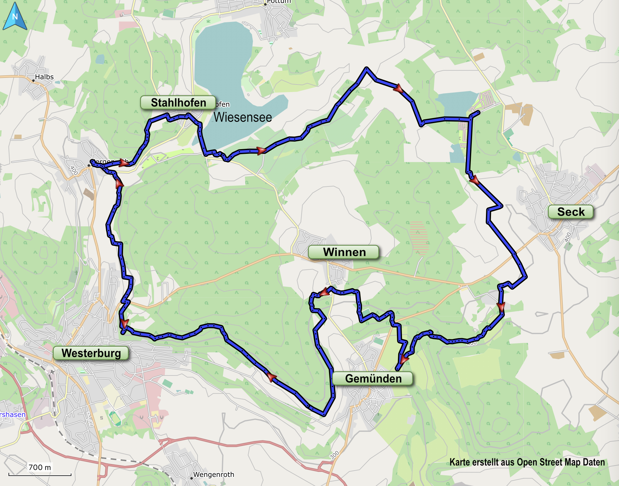 Unser Tourenvorschlag führt durch einige besonders schöne Passagen dieser Region sowie in Randgebiete des Hohen Westerwalds. Gleich drei Gewässer liegen am Weg, der Wiesensee, der „Große Weiher“ und der Secker Weiher. Eine besondere Kostbarkeit ist die 30 m tiefe Holzbachschlucht, die wir auf schmalem Pfad ca. einen Kilometer lang durchwandern. Der Holzbach hat sich dort in die Basaltblöcke eingegraben und bietet stellenweise einen wildbachartigen Anblick. Die Schlucht mit ihren bizarren Felsformationen ist eines der ältesten Naturschutzgebiete des Westerwaldes. Insgesamt zeichnet sich die Tour durch einen anregenden Wechsel von Wald- und Wiesenpassagen aus. Besonders reizvoll ist der hohe Anteil schöner Wege, die zum Teil quer über die Wiesen verlaufen. Die überwiegend sanften Ab- und Aufstiege bieten immer wieder schöne Panoramablicke, die sich auch auf zahlreichen Rastplätzen genießen lassen. Gleich nach dem Start an der Touristeninformation wandern wir durch das Areal eines Golfplatzes und genießen weite Blicke auf den Wiesensee. Nun geht es zielstrebig in Richtung „Großer Weiher“ und „Secker Weiher“. Nach gut 3 km erreichen wir den „Großen Weiher“, nachdem wir kurz zuvor auf den Westerwald-Steig gestoßen sind. Diesem werden wir nun über weite Teile der Tour bis Hergenroth folgen. Am „Großen Weiher“ bietet sich sowohl eine Reihe schön gelegener Bänke als auch die erste Einkehrmöglichkeit, der „Weiherhof“, für eine erste Pause an. Nicht weit entfernt davon befindet sich der kleine „Secker Weiher“. Von der ruhig gelegenen Bank Nr. 10 hat man einen schönen Blick auf dieses idyllische Gewässer. Auf dem Weiterweg erreichen wir eine weitere Einkehrmöglichkeit, das Hof-Café Dapprich. Dahinter folgt einer der schönsten Abschnitte dieser Runde: die Holzbachschlucht, die wir nach wenigen hundert Metern erreichen. Auf dem Weg dorthin passieren wir einen Friedhof, der zum Hofgut Dapprich gehört, der einzige Privatfriedhof in Rheinland-Pfalz. Ein schmaler, naturbelassener Pfad führt durch die Schlucht und vermittelt zahlreiche Natureindrücke, die auch von zwei schönen Rastplätzen genossen werden können. Am Ende dieser Passage herrlicher Blick auf Gemünden und seine alte Stiftskirche. Es folgt die einzige wirklich anstrengende Passage. Auf einem Mix aus befestigten und unbefestigten Wanderwegen geht es auf knapp 2 km ca. 110 Höhenmeter bergauf, bis wir uns auf der Höhe von Winnen befinden und mit dem Rastplatz Nr. 7 einen der schönsten Aussichtspunkte des Westerburger Landes erreicht haben. Zu unseren Füßen liegt Gemünden mit dem Turm seiner Stiftskirche; und von da schweift der Blick in die Ferne bis zu den höchsten Taunusbergen. Nach einer abwechslungsreichen Passage ohne nennenswerte Höhenunterschiede erreichen wir den nächsten Höhepunkt, die Aussichtskanzel auf dem Katzenstein-Felsen mit einer phänomenalen Aussicht auf Westerburg und bis in die Taunusberge und die Wälder der Montabaurer Höhe. Kurz vor Westerburg können wir in einem kleinen Schlenker einen weiteren Aussichtspunkt erreichen, von dem sich das Westerburger Schloss durch das Blätterwerk des Waldes erkennen lässt. Auch hinter Westerburg genießen wir die auffallend liebevolle Streckenführung. Bald treffen wir wieder auf den Wiesensee und wandern entlang der Uferpromenade zurück zum Parkplatz.