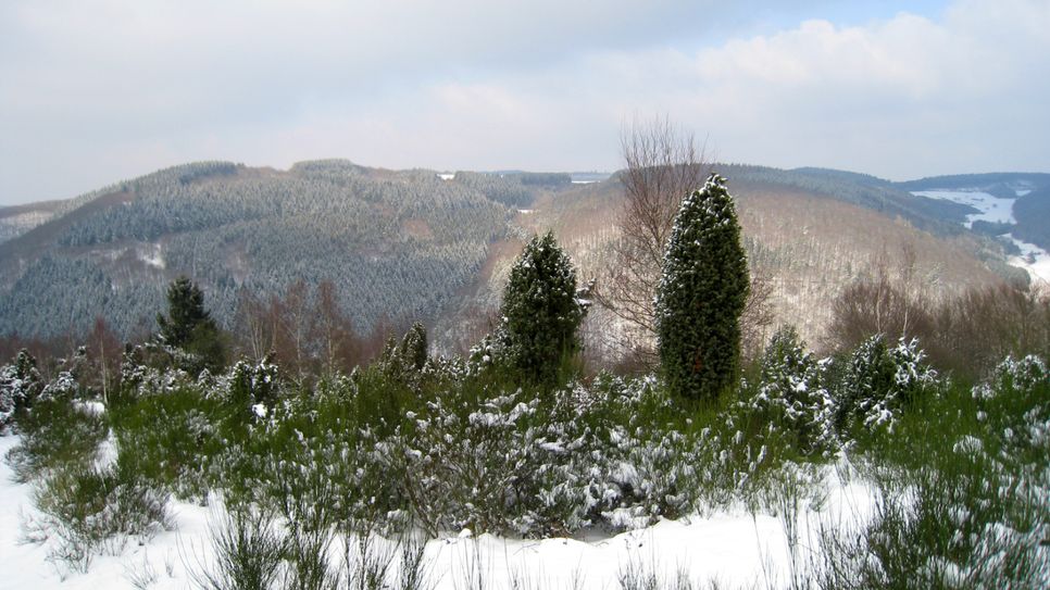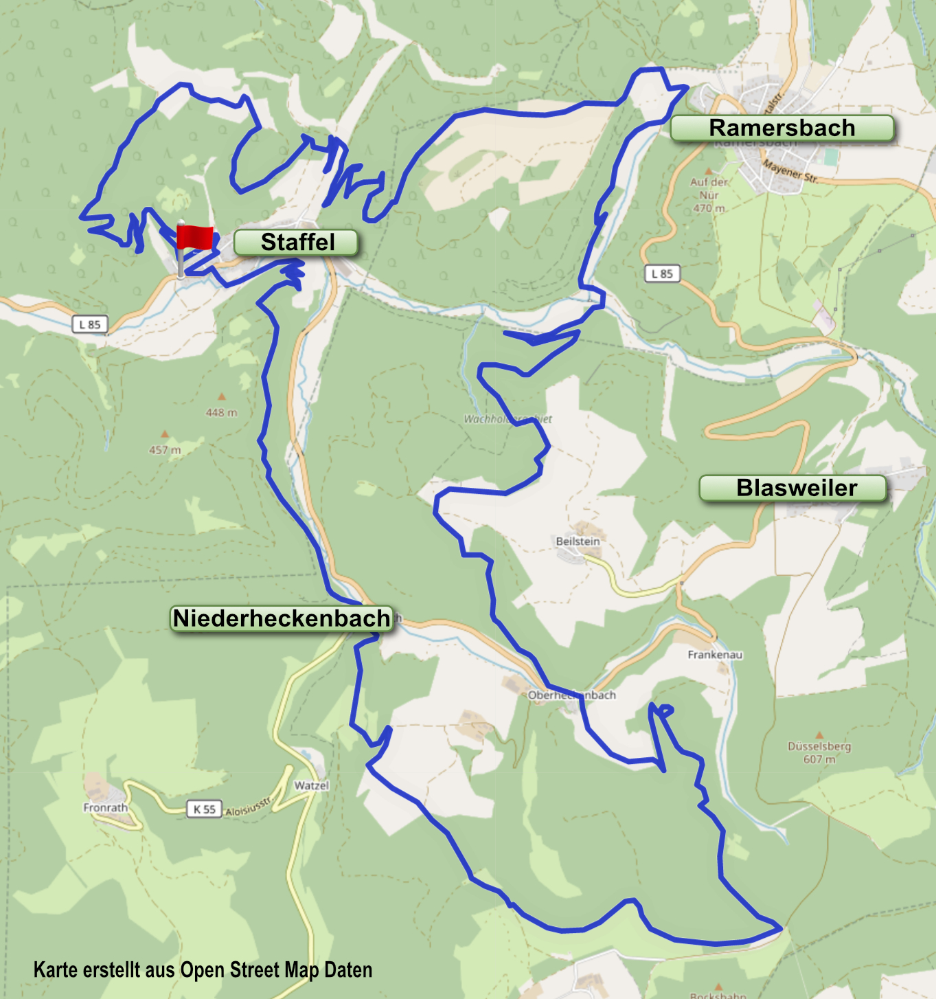 Diese Tour stellt aufgrund ihrer Länge und der fast 1000 Höhenmeter eine echte Herausforderung dar, und wir sollten gleich erklären, warum wir sie ausgerechnet in der Zeit der kürzesten Tage vorschlagen. Die Route führt über einige Höhen, und wer sich eine Schneewanderung wünscht, kann sich auf eine weiße Pracht abseits der Touristenströme freuen. Die Länge ist kein wirkliches Problem, denn die Strecke kann gekürzt bzw. in kleinere Etappen aufgeteilt werden. Und solange es weiß bleibt, gibt es ein weiteres Plus: Einige Passagen sind durch Waldarbeiten stark in Mitleidenschaft gezogen; der Schnee deckt diese Wunden weitgehend zu. Wir wandern zunächst am oberen Rand des Heckenbachtals von Staffel nach Niederheckenbach. Stellenweise erhalten wir hier schöne Blicke ins Tal und auf die gegenüberliegenden Höhen, über die wir Stunden später gehen werden. In Niederheckenbach beginnt ein langer Anstieg Richtung Cassel; aber bevor dieser Ort noch sichtbar ist, geht es den Bockshahn entlang durch eine Waldpassage, in der wir uns ohne GPS-Führung kaum zurechtfinden würden. In völliger Einsamkeit stoßen wir auf ein Wegkreuz von 1652, das an einen Petter Oler erinnert, der hier, mitten im tiefen Wald, gestorben ist, und kommen anschließend zu einer Besonderheit dieser Tour, der „Teufelsburg“. Es handelt sich um übereinander getürmte Eruptivsteine, deren etwas unheimlicher Anblick den Namen leicht erklärlich macht. Bald sind wir in Oberheckenbach, und nach einem weiteren Anstieg durchqueren wir ein herrliches Stück Wacholderheide, ehe wir wieder abwärts ins Tal des Staffeler Bachs wandern. (Wer die Abkürzung wählt, kehrt entlang des Bachs nach Staffel zurück.) Die große Runde führt wieder ganz hinauf ins Ahrgebirge, über eine weite Hochfläche. Bevor wir unseren Weg links fortsetzen, eröffnet ein kurzer Abstecher von ca. 70 m nach rechts zu einer Bank eine grandiose Aussicht weit nach Süden auf die anfangs durchwanderten Höhen und weit darüber hinaus. Der Weiterweg führt über eine schöne Hochfläche, dann geht es in Serpentinen bergab in ein Seitental des Staffeler Bachs (auch von hier könnte man direkt zurück) und schließlich ein letztes Mal nach oben. Es folgt eine weitere einsame Hochebene, dann beginnt ein langer Abstieg in Serpentinen, und schließlich bringt uns ein reizvoller Pfad zurück nach Staffel.