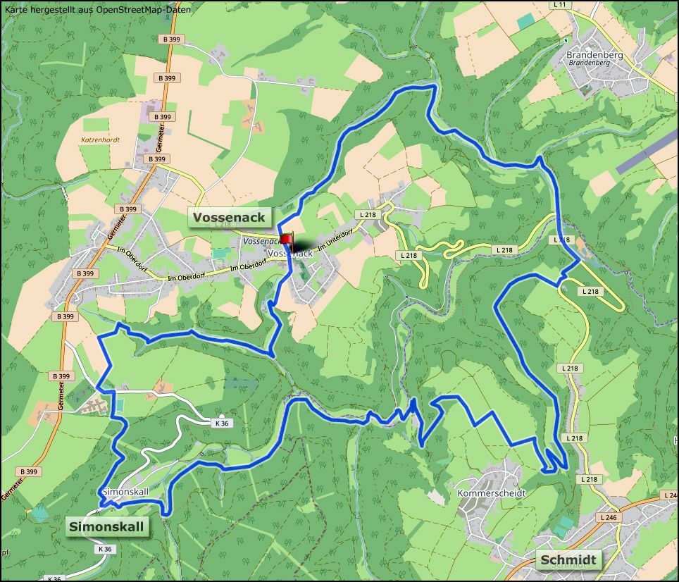 Wir starten in Vossenack an der Kirche, genießen gleich danach eine erste Aussicht in Richtung Raffelsberg, steigen ins romantische Bosselbachtal ab und gelangen weiter zu den Auenlandschaften des Tiefenbachs, bis wir die Kall erreichen. Nun geht es zum ersten Mal bergauf zum Kältberg mit schönem Rastplatz. Anschließend treffen wir auf den Kumbach und folgen ihm aufwärts, vorbei an Mausbach und Froitscheidt. Dann verlassen wir den Bach, wandern unterhalb von Kommerscheidt weiter bergauf und kommen zum nächsten Aussichtspunkt.