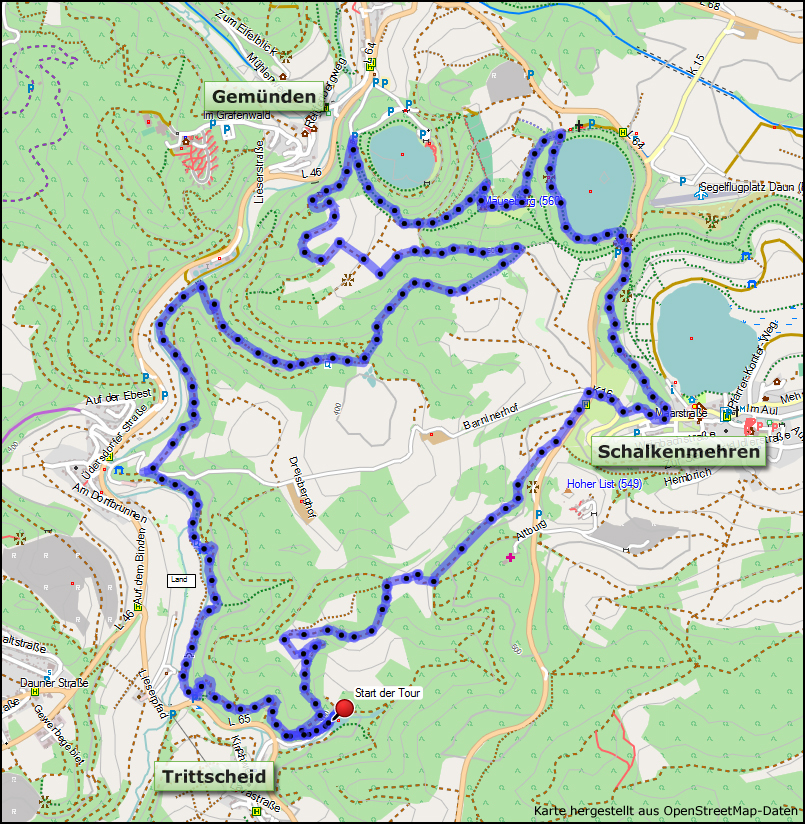 Unser September-Tourenvorschlag führt zu drei bekannten Maaren der Vulkaneifel: Schalkenmehrener, Weinfelder sowie Gemündener Maar. Bei der Wegführung haben wir uns allerdings nicht nur auf diese Höhepunkte konzentriert, sondern uns um einen abwechslungsreichen Streckenverlauf mit schönen Aussichtspunkten bemüht. Außerdem sollte die Strecke Ortschaften weitgehend vermeiden und möglichst wenig Asphalt aufweisen. Wir haben daher auch Passagen gewählt, die nicht als Wanderwege ausgewiesen, ausnahmslos aber gut zu begehen sind. Schon der Ausgangspunkt verweist auf die eigenwillige Streckenführung: Wir starten die Tour südlich von Daun, in der Nähe von Trittscheid, an einem kleinen Weiher mit Parkgelegenheit. Von dort geht es zunächst durch Wald und Felder nach Schalkenmehren, wo die eigentliche Maare-Wanderung beginnt: Vom Schalkenmehrener Maar wandern wir zum Weinfelder Maar, dessen düsterer Zweitname „Totenfelder Maar“ gar nicht so recht zu dem Eindruck passt, den man beim Anblick dieses Juwels bekommt. Weiter steigen wir hinauf zum Mäuseberg, dem höchsten Punkt unserer Runde, und treffen dort auf den denkmalgeschützten Dronke-Turm. Von der Aussichtsplattform des knapp 11 Meter hohen Turms schauen wir auf das Gemündener als auch auf das Weinfelder Maar und genießen den Panoramablick über die gesamte Vulkanlandschaft rund um Daun, bei gutem Wetter sogar bis in den Hunsrück. Der folgende Abstieg bringt uns zunächst zum Gemündener Maar und bald darauf zu einer schön gelegenen Einkehrmöglichkeit. In einem Bogen ziehen wir dann durch Wiesen, Felder und Wald noch einmal bergauf und werden wiederholt mit tollen Ausblicken für die Mühen des Aufstiegs belohnt. Gemächlich geht es wieder bergab, und wir können uns mit einem kurzen Abstecher aus einem Sauerbrunn mit köstlich prickelndem Wasser erfrischen. Bald dahinter treffen wir auf die Lieser, der wir auf dem berühmten Lieserpfad nun über eine längere Zeit bis zur Üdersdorfer Mühle folgen. Von dort sind es nur noch wenige hundert Meter bis zu unserem Ausgangspunkt. Besonders an den Maaren finden sich immer wieder schöne Rastgelegenheiten mit herrlichen Ausblicken. Außerdem haben wir vier verschiedene Einkehrtipps, die sich über die gesamte Strecke verteilen, zusammengestellt – ein seltener Luxus in der Eifel!
