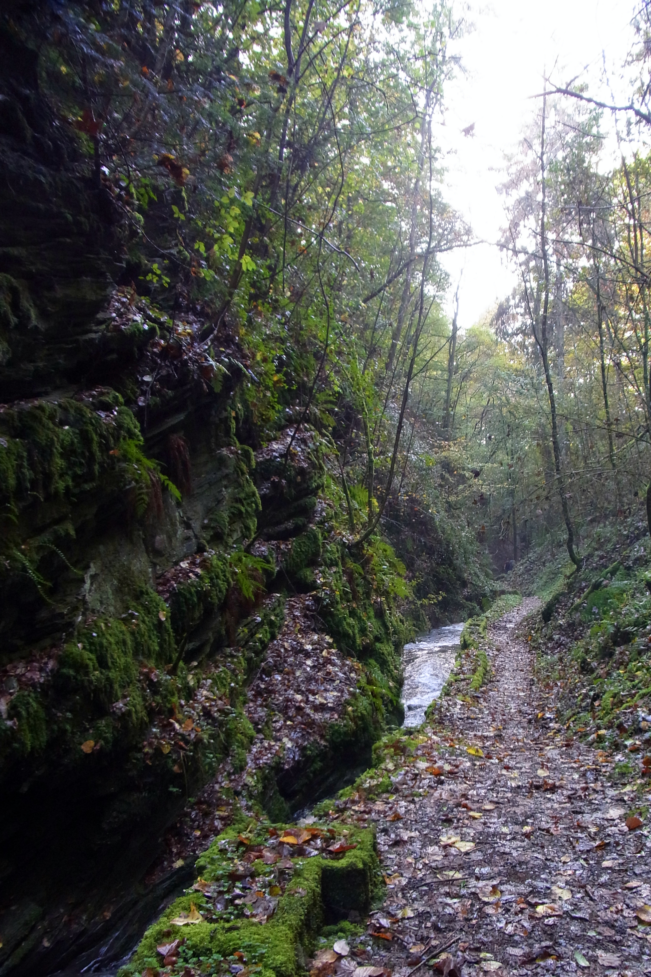Nun geht es weiter abwärts, zuletzt steil einen kleinen Bach entlang, bis an den Ortsrand von Zell, wo wir ins Tal des Linischbachs einbiegen und die romantische »Liebesschlucht« durchwandern. Das Tal verengt sich in dieser Passage schluchtartig, der schmale Pfad verläuft unmittelbar neben dem in den Fels eingesenkten Bach. Nur ein Liebespaar, das sich eng aneinander schmiegt, kann in diesem romantischen Abschnitt nebeneinander gehen. Man sollte diese Passage besonders genießen: In den letzten Jahren war die Schlucht zeitweise wegen Gefahr einer Hangrutschung gesperrt; zurzeit ist sie gefahrlos zu begehen. Der Weg mündet in eine frühere Kneipp-Anlage, in der auch einige alte Bänke stehen.