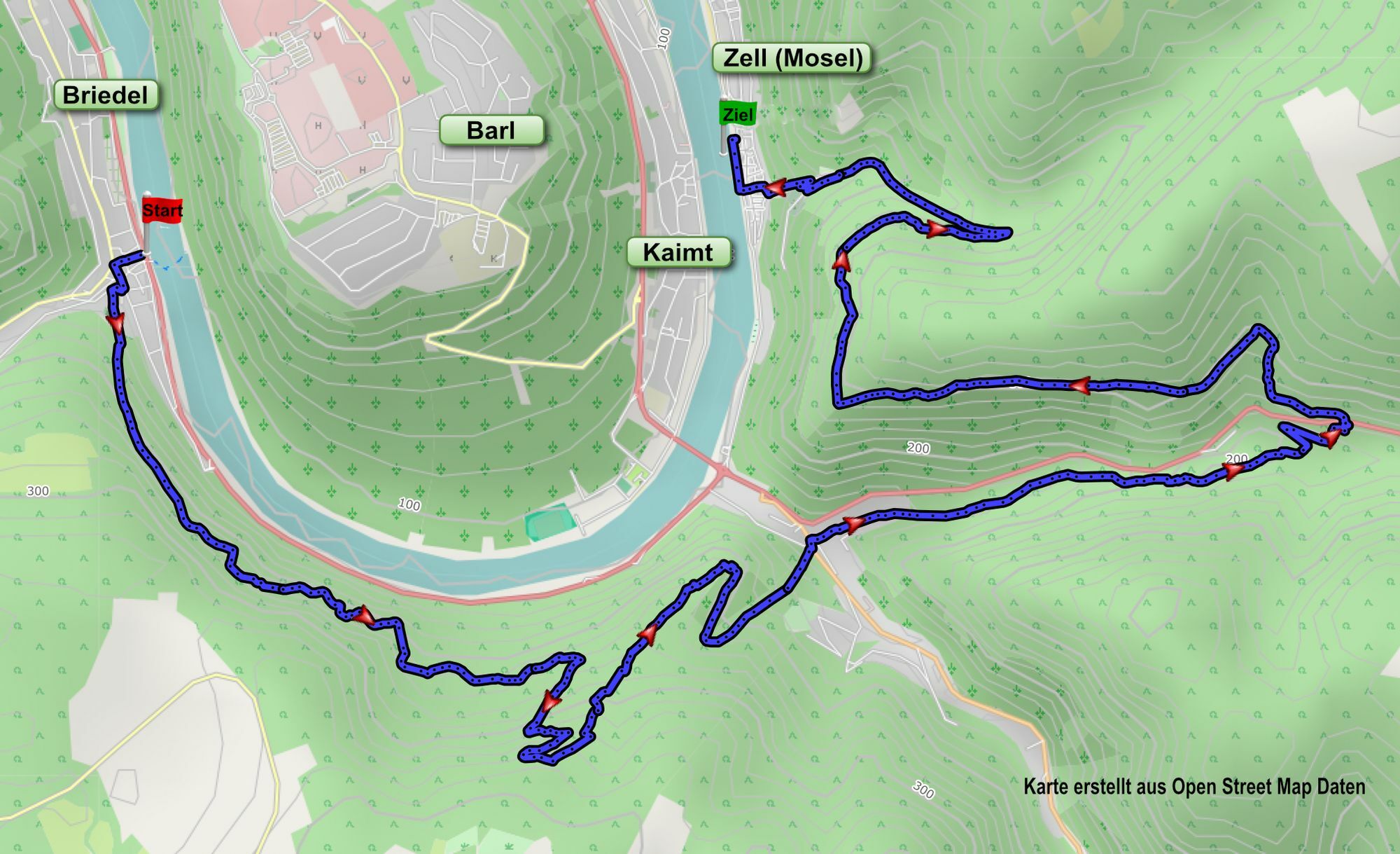 »Im weiten Bogen um die Moselschleife bei Zell« könnte die Kurzbeschreibung für unseren Vorschlag, der in Briedel startet, lauten. Er führt zu spektakulären Aussichtspunkten und taucht zwischendurch tief hinunter in eine »Liebesschlucht«. Von Briedel steigen wir anfangs steil an, vorbei an der Kirche und durch den Friedhof. Dahinter führen uns Pfade durch die Briedeler Schweiz, zunächst zur exponierten Kanzel der Hindenburglay, dem ersten Höhepunkt, und weiter zur »Schönen Aussicht«. Beide Plätze bieten einen herrlichen Blick auf die Moselschleife und die gegenüberliegenden Weinberge. Ein reizvoller Pfad bringt uns hinunter zum Beinter Kopf, ebenfalls mit ausgesetzter Felskanzel und tollen Blicken.