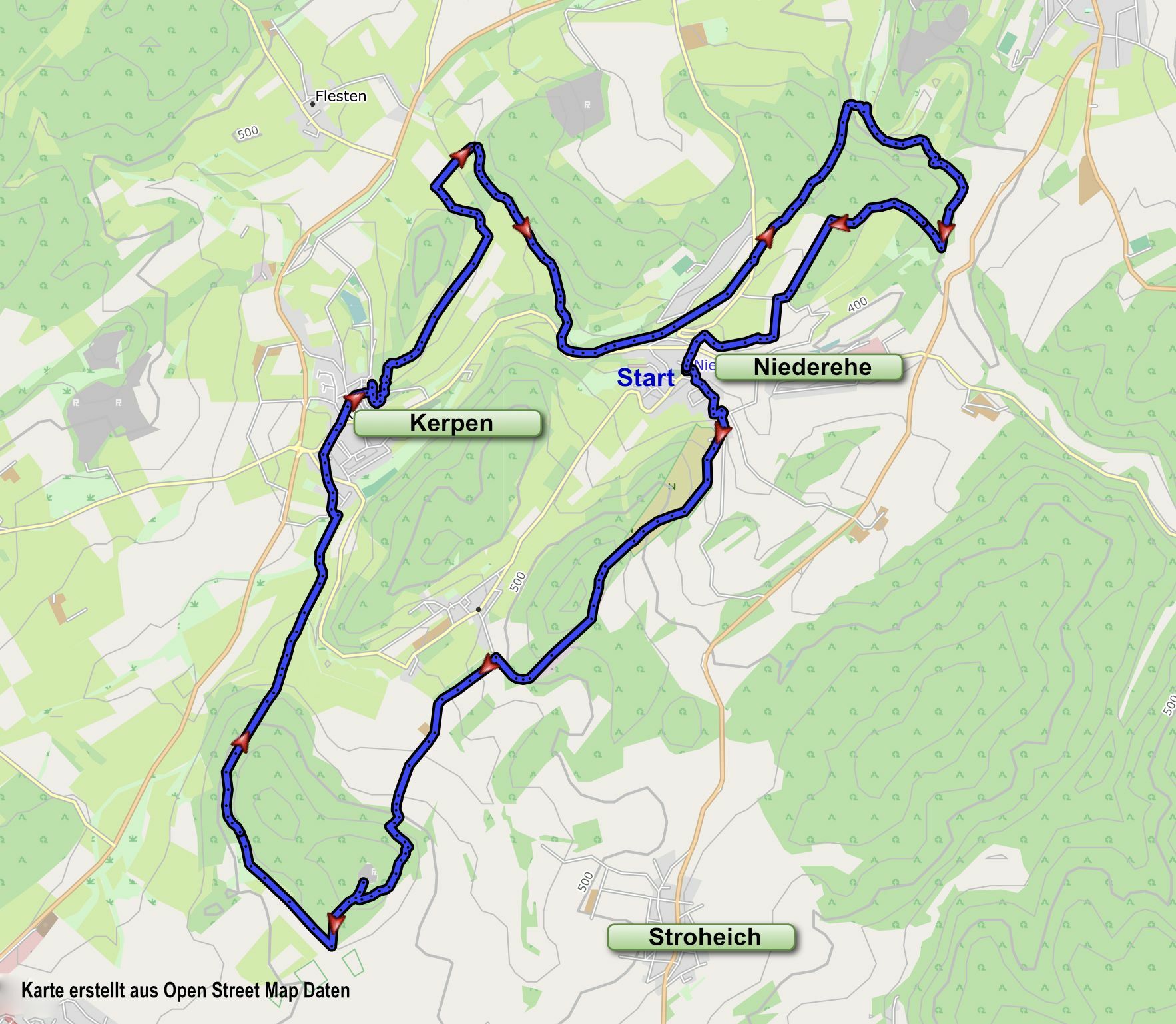 Zwei Bänke laden hier zur Rast und zur eingehenden Betrachtung dieser geologischen Kostbarkeit, die sich mit ihrem auffälligen Moosbewuchs erst in den letzten 100 Jahren zur jetzigen Form ausgebildet hat und immer noch weiter ausformt. Danach führt der Weg eine Zeitlang am Ahbach entlang, bevor es wieder durch Wald nach oben geht, wo man ein letztes Mal weite Blicke auf Niederehe und Umgebung und damit auch auf den Anfang unserer Runde genießen kann, ehe der Weg steil hinunter nach Niederehe, dem Ausgangspunkt der Wanderung, führt.
