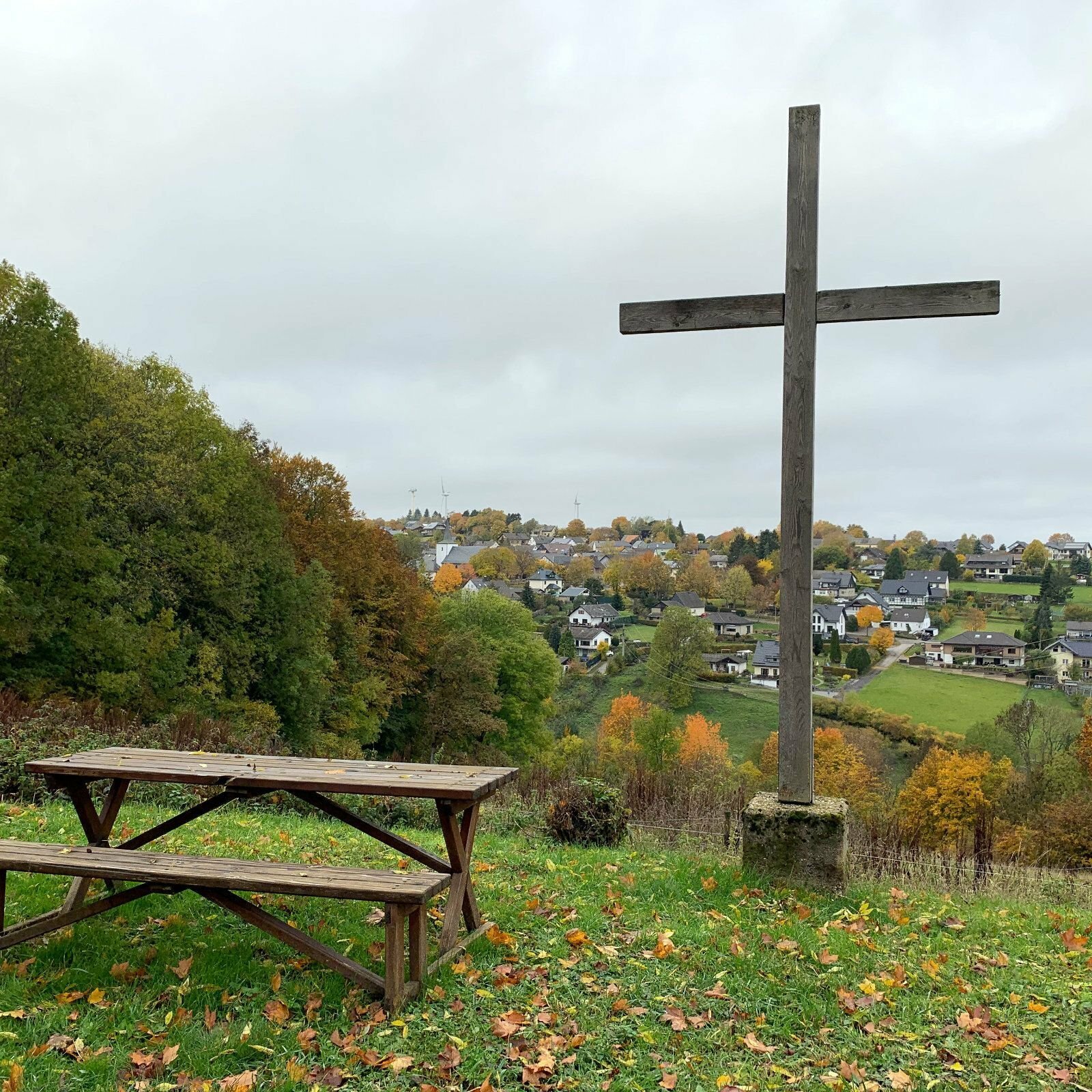 Vom Start gehen wir kurz taleinwärts, steigen dann erstmal hoch in eine Wiesenlandschaft mit Blick auf Frohngau. Noch einmal müssen wir hinunter ins Tal, dann führt ein zweiter Anstieg auf eine weite Hochebene. Vor allem vom Eifelblick »Hagelkreuz« bei Buir genießen wir ein herrliches Panorama, in dem besonders der Michelsberg den Blick auf sich zieht.