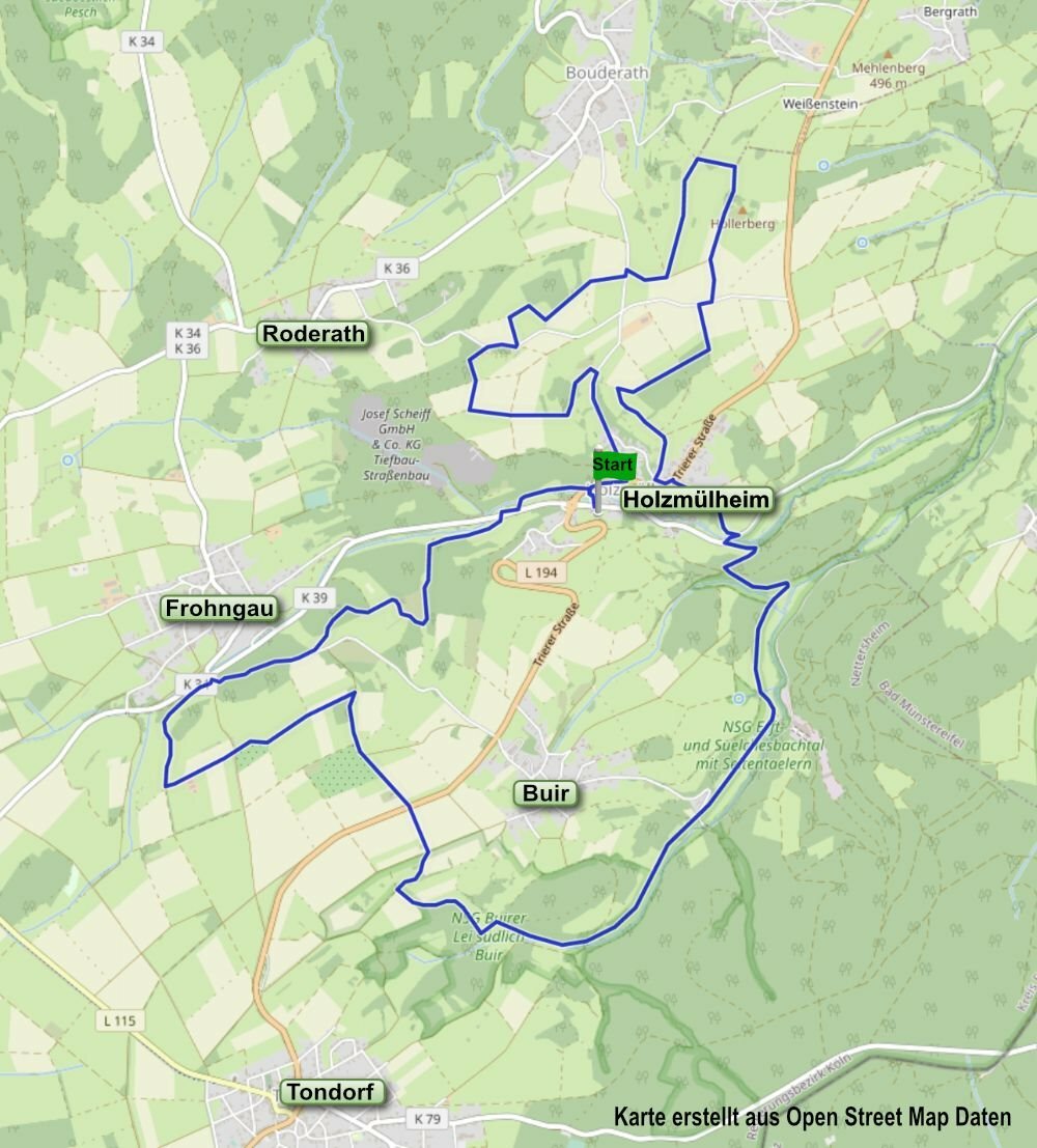 Die aussichtsreiche Wanderung führt vor allem über die Höhen bei Frohngau, Buir und Holzmülheim und als Kontrast durch das verträumte Tal des Ohbachs.