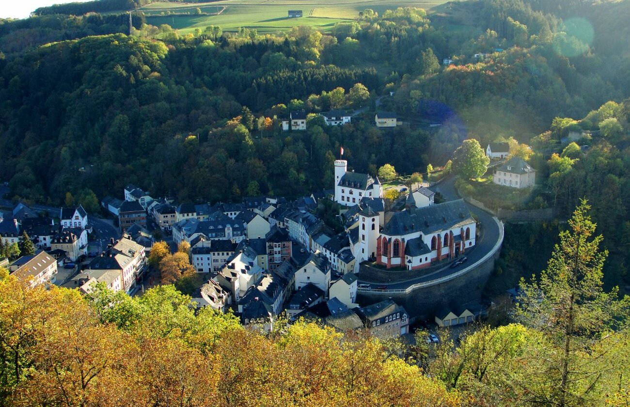 Wir starten direkt in Neuerburg und kommen schnell auf einen Pfad, der an der ehemaligen Stadtmauer entlangführt. Herrliche Blicke auf den mittelalterlichen Stadtkern! Anschließend passieren wir die Eligius-Kapelle, und nach einem Wechsel der Talseite geht es in einem längeren Anstieg auf den aussichtsreichen Eligiusberg, von dort auf dem Branntwein-Pfad wieder abwärts. Wenn dieser eigentlich sehr reizvolle Pfad zu sehr verkrautet ist, lässt er sich in einem größeren Bogen über den Mosel-Our-Weg umgehen. Anschließend geht es in leichtem Auf und Ab zum Aussichtspunkt Ritter Kuno von Falkenstein-Blick.