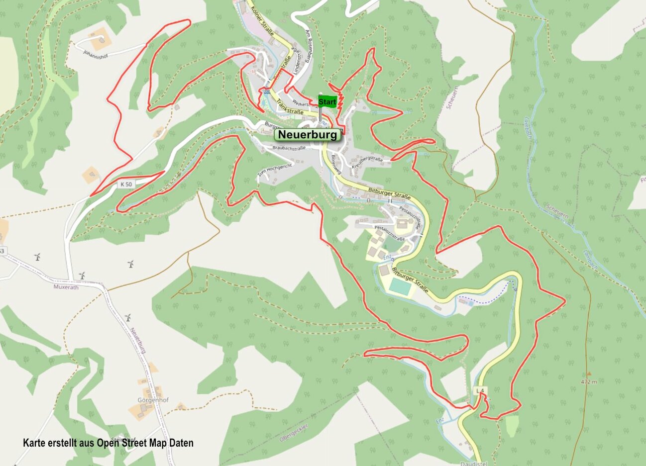 Die gesamte Runde ist trotz ihrer mäßigen Länge nicht ohne, sind doch mehr als 500 Höhenmeter zu bewältigen. Wir geben zwar keine Abkürzung an, aber da man sich die meiste Zeit nahe an Neuerburg bewegt, lässt sich die Tour an verschiedenen Stellen verkürzen, z.B. indem man nicht zur Kreuzkapelle hoch-, sondern direkt in den Ort hinuntergeht.