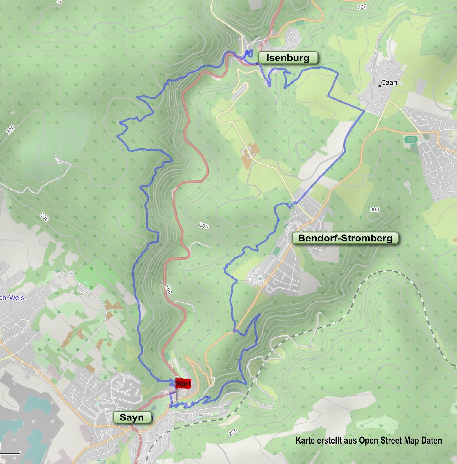 Wir wandern von Sayn landeinwärts, auf dem Hinweg ist die Isenburg das Ziel. Zurück geht es auf der anderen Talseite des Saynbachs, erst auf die Höhe zwischen Caan und Stromberg, zuletzt auf dem Traumpfad »Saynsteig« über romantische Pfade und mit den Höhepunkten »Oskarhöhe« und zuletzt Burg Sayn.