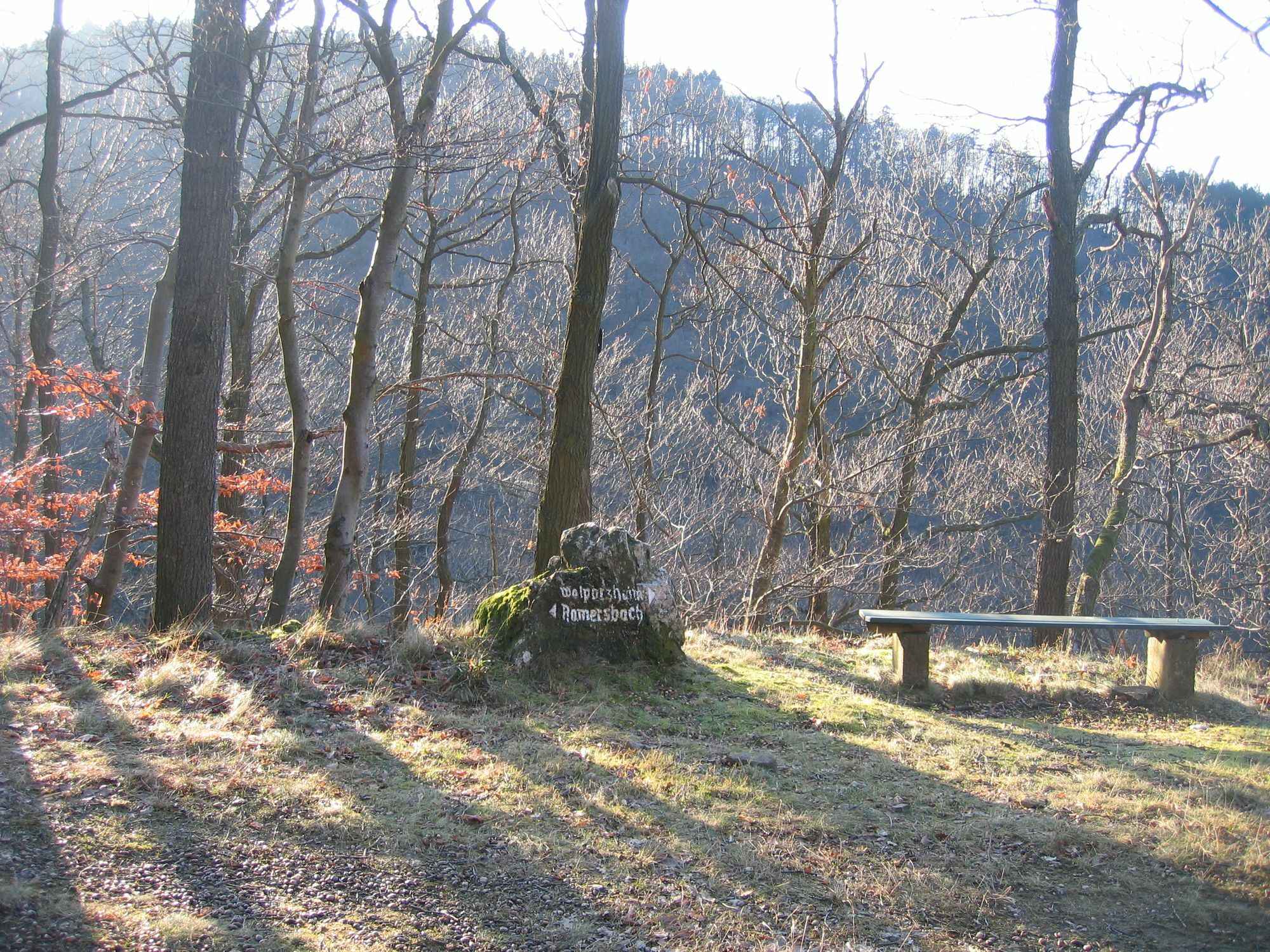 Die großen Aufstiege sind geschafft, und es geht jetzt fast nur noch bergab. Dabei treffen wir an einer Kreuzung etwas zurückgesetzt auf das Schwarze Kreuz, ein Basaltkreuz aus dem 17. Jh., dessen Inschrift sich mit etwas Mühe noch entziffern lässt. Unser nächstes Ziel ist der Steinthalskopf, von dessen luftiger Warte aus wir auf den Krausberg blicken und sehen, welche Strecke wir schon zurückgelegt haben und bekommen ganz andere Ausblicke als noch vom Krausbergturm. Nun führt die Wanderung immer weiter talwärts, Überraschungen hält sie aber immer noch bereit. Die erste ist die Katzley, eine steile Erhebung oberhalb der Ahr, von der aus wir auch auf die gegenüberliegenden Felsen und Weinberge und auf das schön gelegene Restaurant „Försters Weinterrassen“ sehen. Es folgt ein steiler Abstieg (besondere Vorsicht bei Nässe!), der aber auch umgangen werden kann; wir kommen an die Ahr und können zum Abschluss der Tour einen Höhepunkt genießen: Vorbei an einer Quelle führt ein romantischer Weg oberhalb der Ahr nach Dernau zurück und gibt immer wieder Blicke zum Fluss und nach oben auf die steilen Felsen frei.